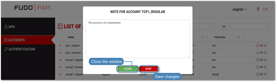 - Add or edit the note and click to store changes or to close the window without saving your changes.
