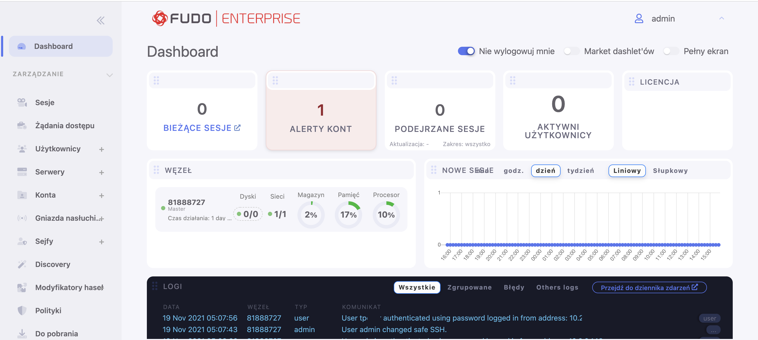 Panel Administracyjny to centralny interfejs zarządzania w Fudo Enterprise, przeznaczony głównie dla administratorów. Udostępnia on narzędzia do konfiguracji systemu, zarządzania użytkownikami, ustawień bezpieczeństwa oraz innych zadań administracyjnych. Jest to centrum zarządzania i konfiguracji systemu Fudo Enterprise.