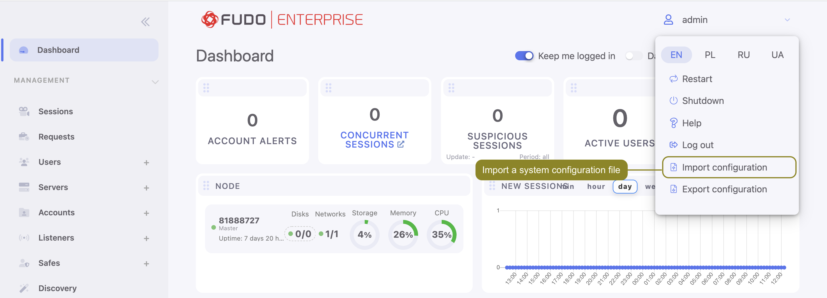 Fudo Enterprise enables exporting current system state, defined objects and configuration settings, which later can be used to initiate the system.
