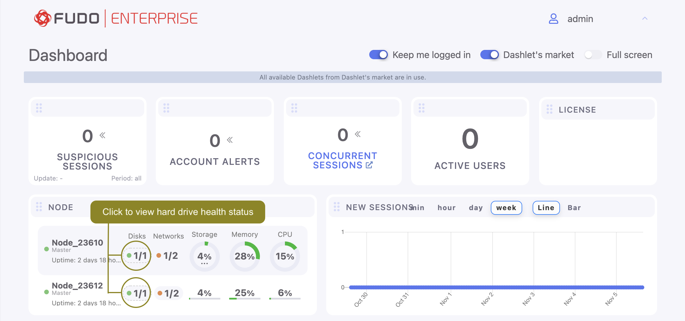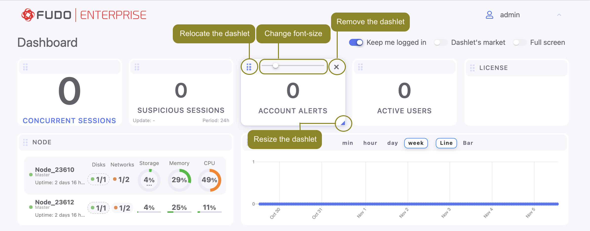 Fudo Enterprise dashboard page enables quick access to essential status information. It comprises customizable dashlets allowing you to pick and choose the data that’s the most important to you.