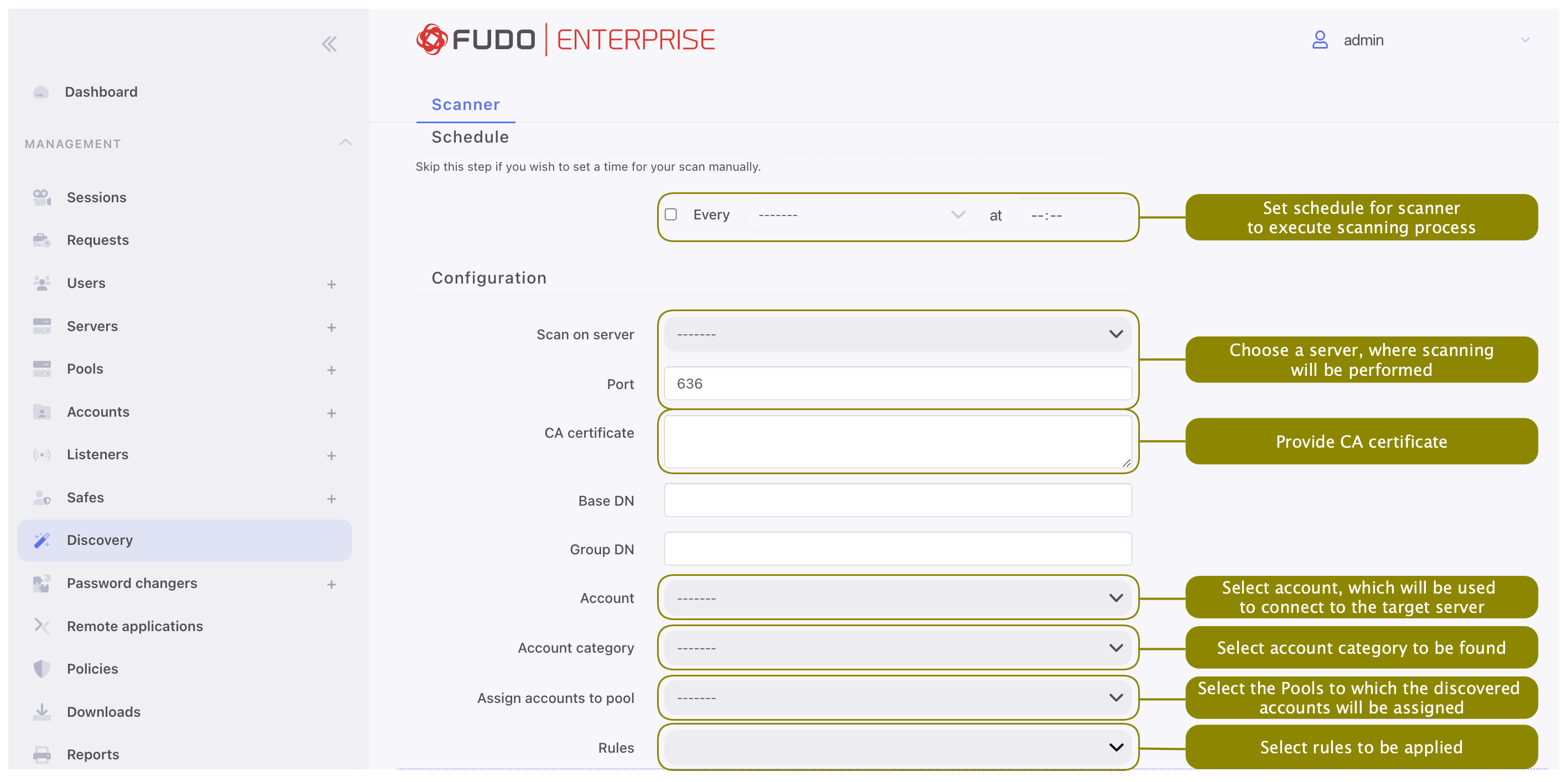 The Discovery feature is able to search domain controllers for accounts with different privilege levels and add them to the relevant safes and/or listeners. This Onboarding process, which grants the discovered accounts access to connections, is a basis of the Discovery feature. Alternatively, the feature can send the accounts to quarantine, which means blocking accounts on the target server.