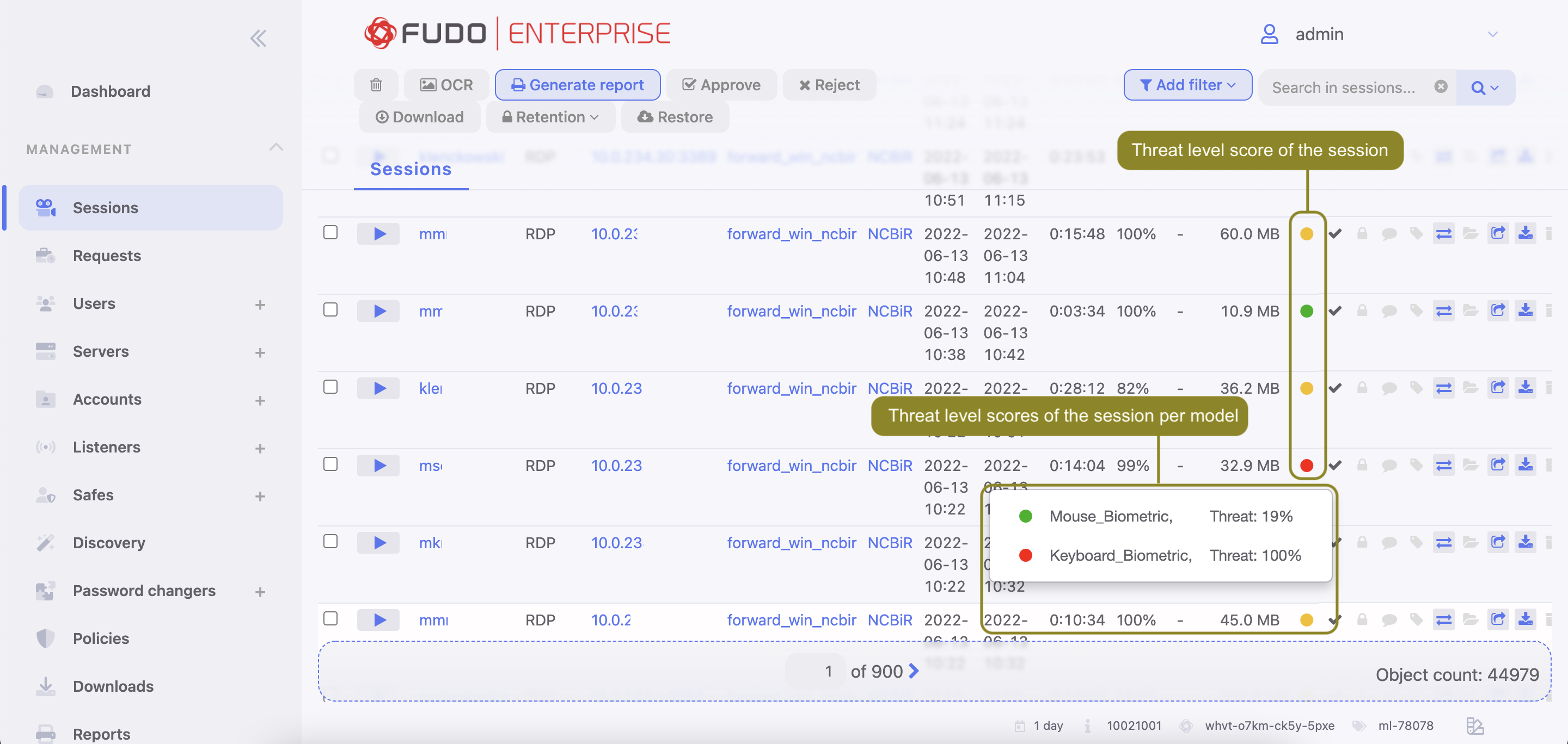 Fudo Enterprise analyzes sessions in real-time and produces threat level scores (OK, LOW, HIGH) depending on how the user fares against the trained model.
