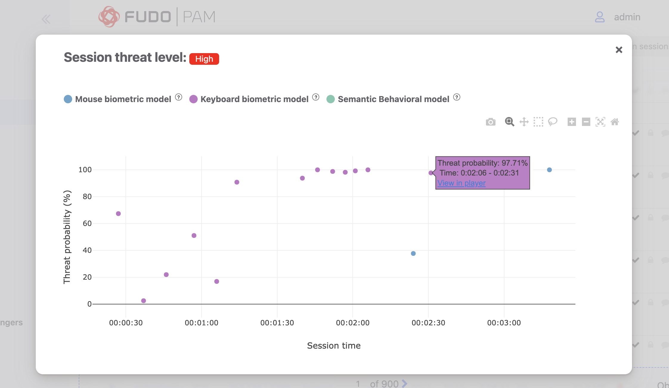 The graph also contains a link to the specific period of the session (segment) in the player which allows the administrator to check the session in real time and react accordingly. The administrator is also able to analyze the results, delivered by the AI training models and take actions for the future sessions by adjusting settings. For example, by adding a policy to be notified when a certain threat probability threshold is reached.