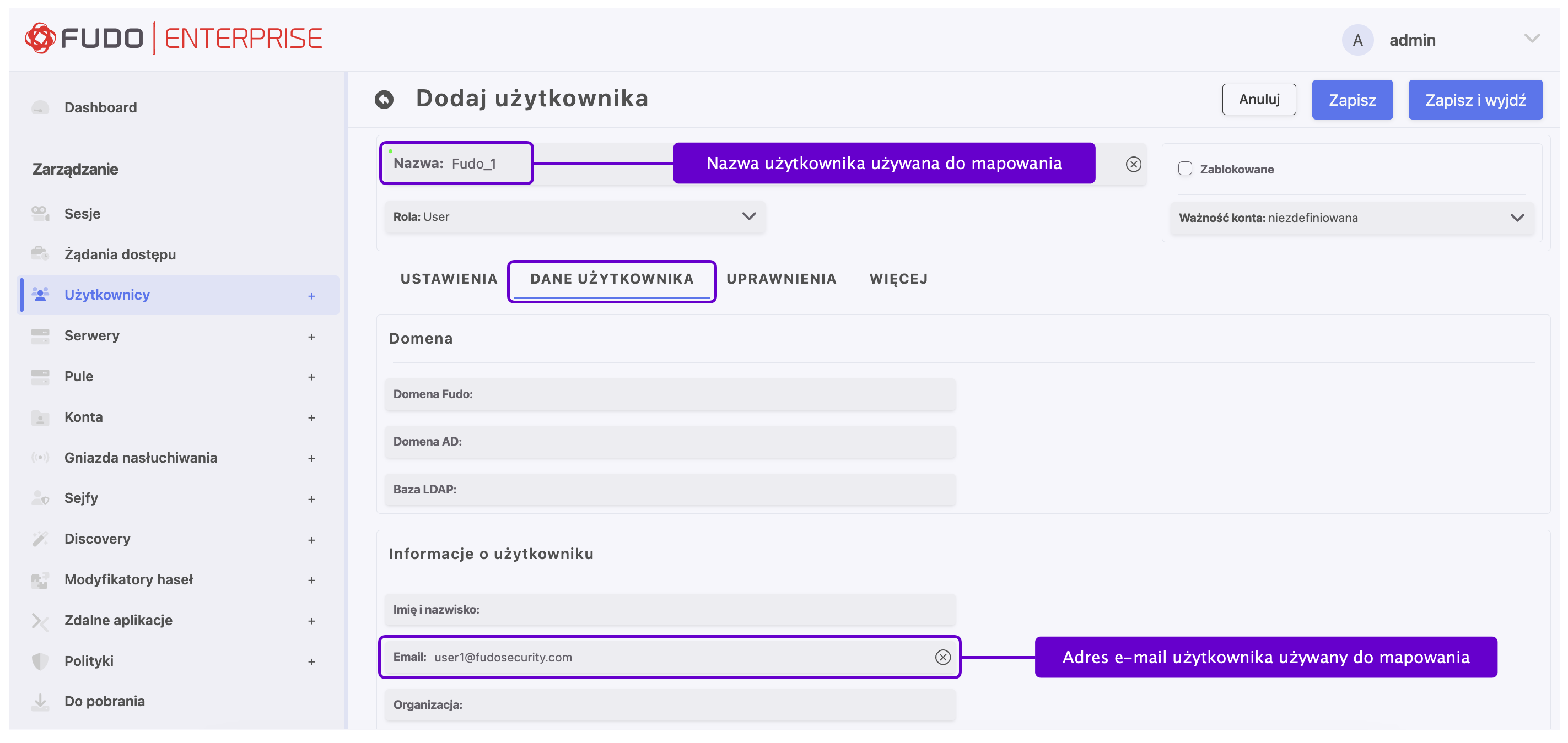 Fudo_1,user1) a pole Email w zakładce Dane użytkownika zawiera faktyczny adres email (np.user1@fudosecurity.com).Konfiguracja: Ustaw Mapowanie emaila na