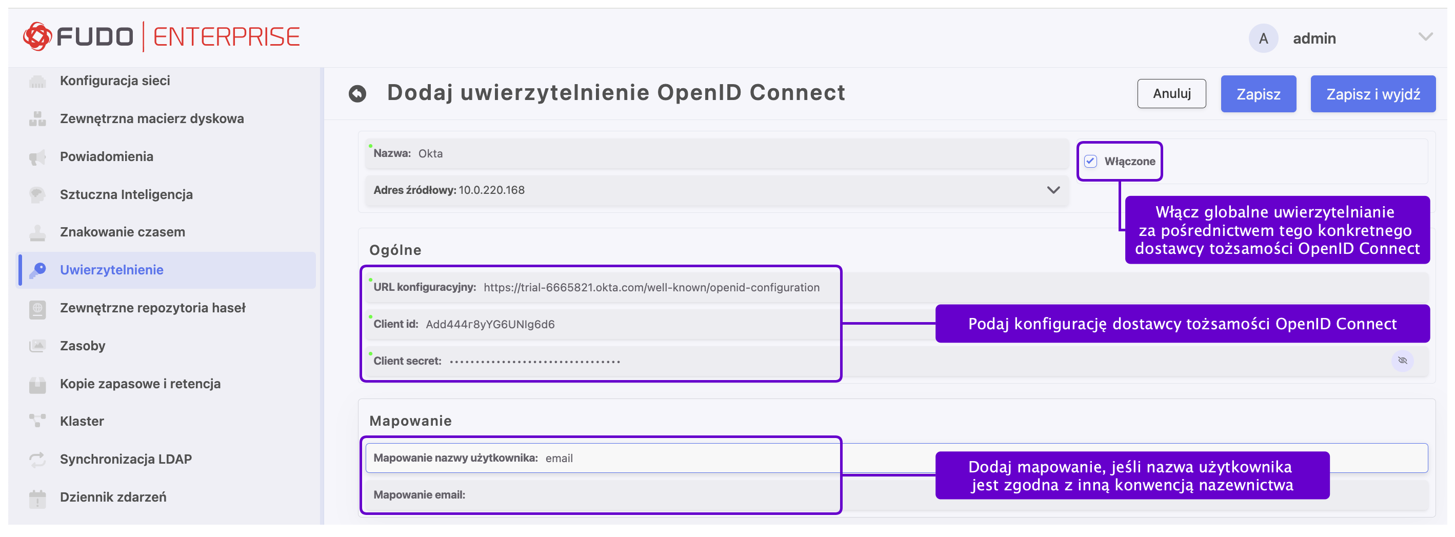 Postępuj zgodnie z instrukcjami, aby skonfigurować metodę uwierzytelniania OpenID Connect: