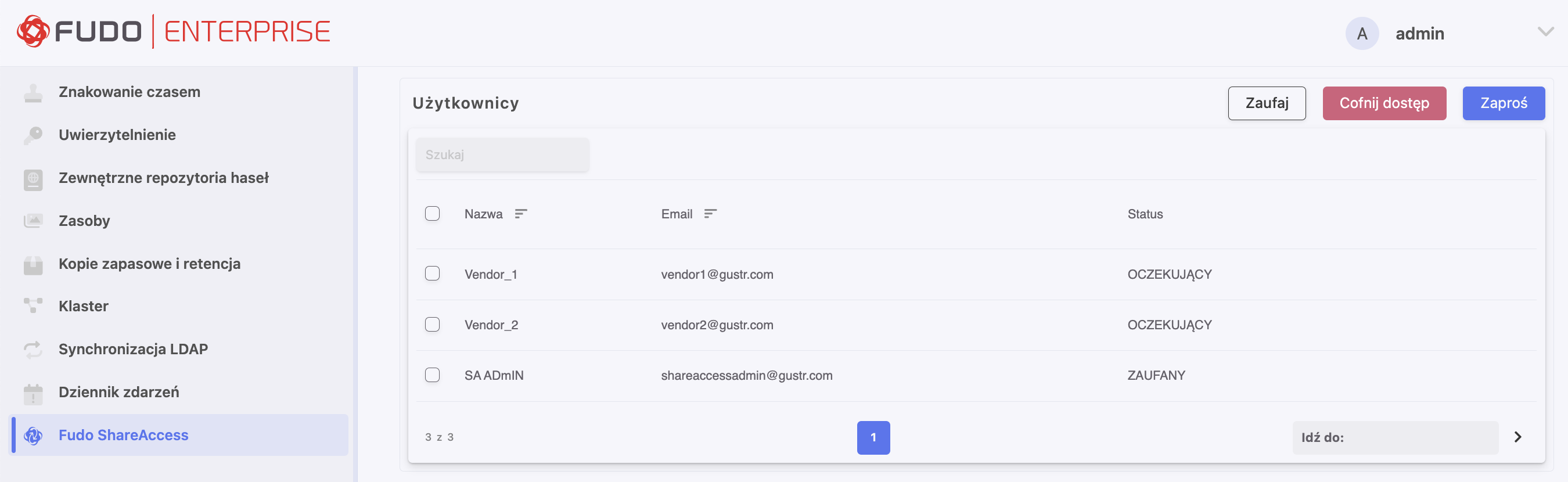 Wymagania dla użytkownika: Użytkownik musi być sparowany z Fudo ShareAccess lub zaproszony do niego.