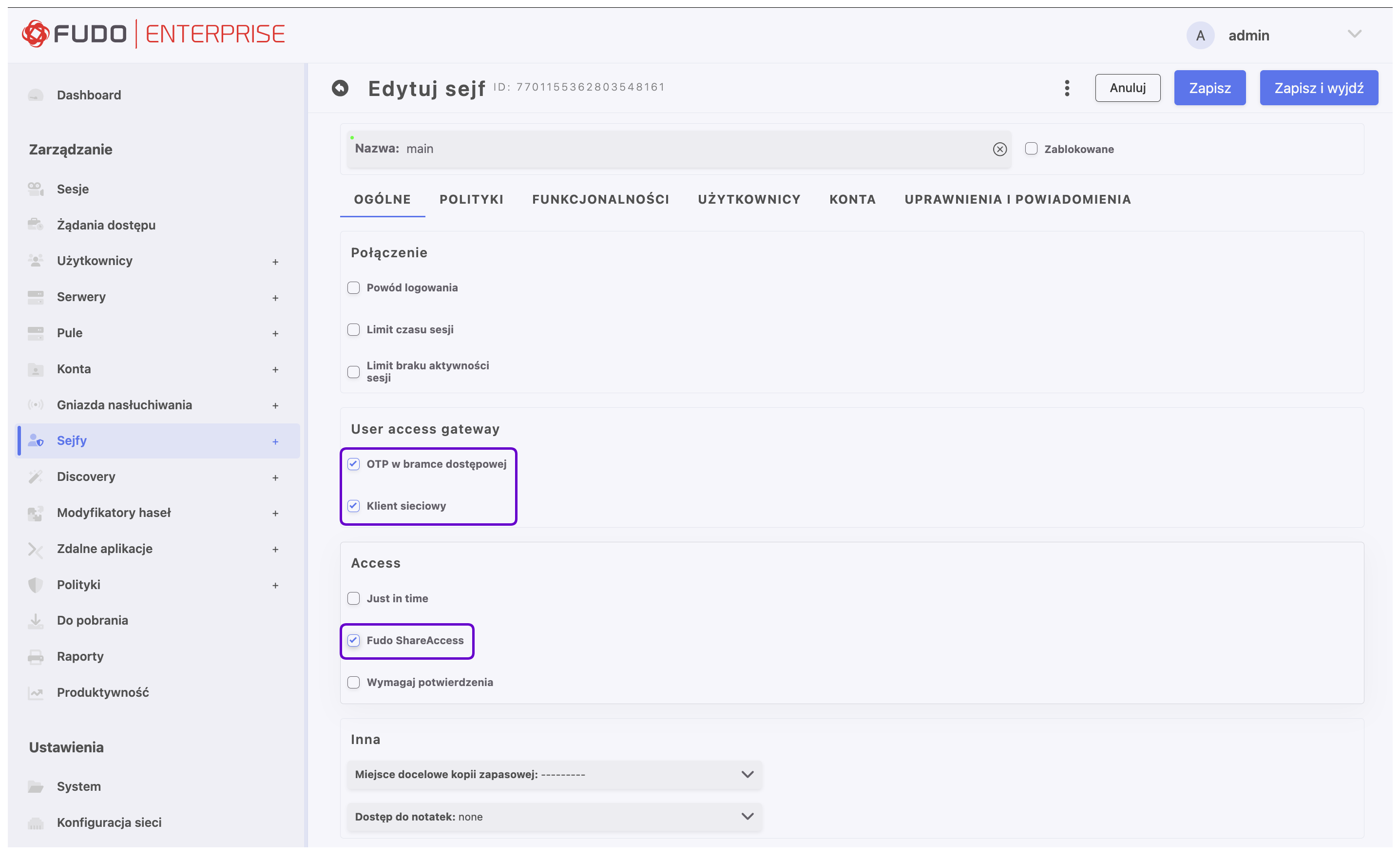 - Wybierz opcję Fudo ShareAccess, aby udostępnić sejf do użytku w Fudo ShareAccess (wymagana).