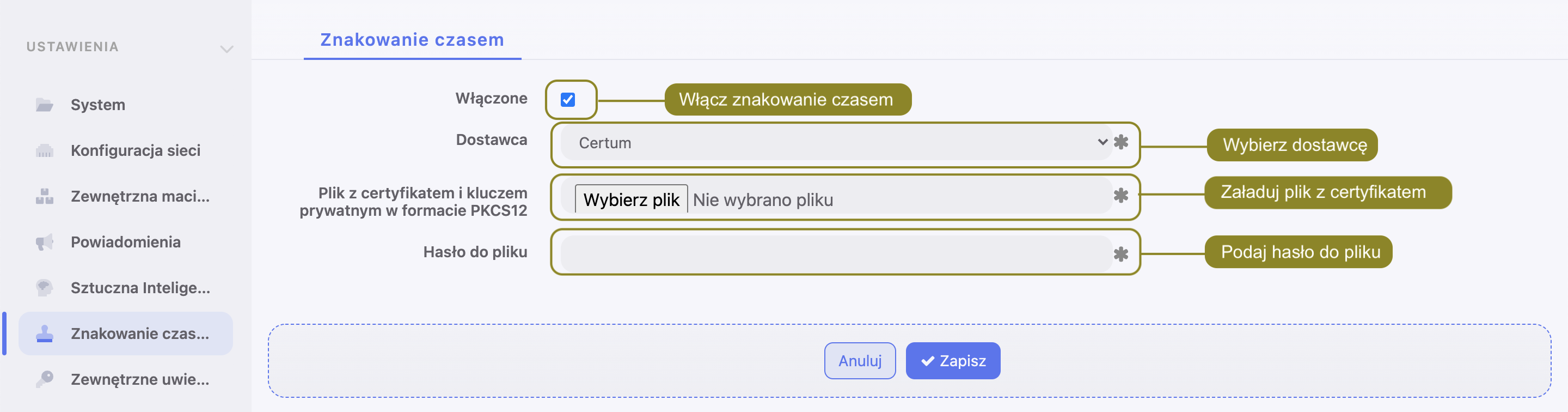 Aby włączyć i skonfigurować usługę znakowania czasem, postępuj zgodnie z poniższą instrukcją.