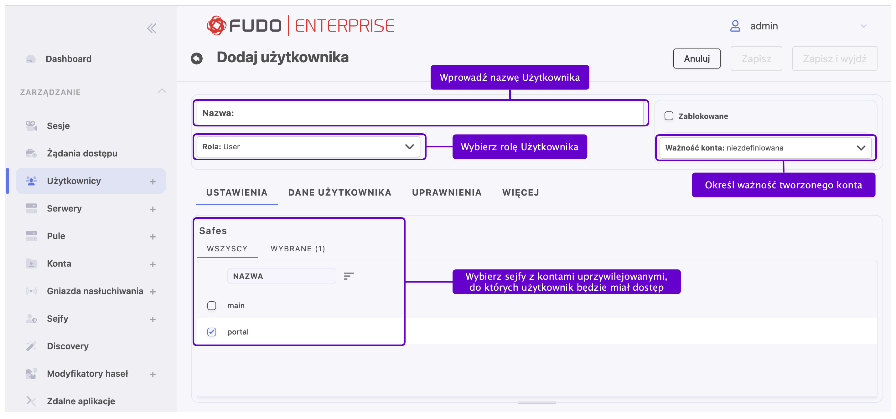 - W zakładce Ustawienia, w polu Sejfy wybierz sejfy z kontami uprzywilejowanymi, do których użytkownik będzie miał dostęp.