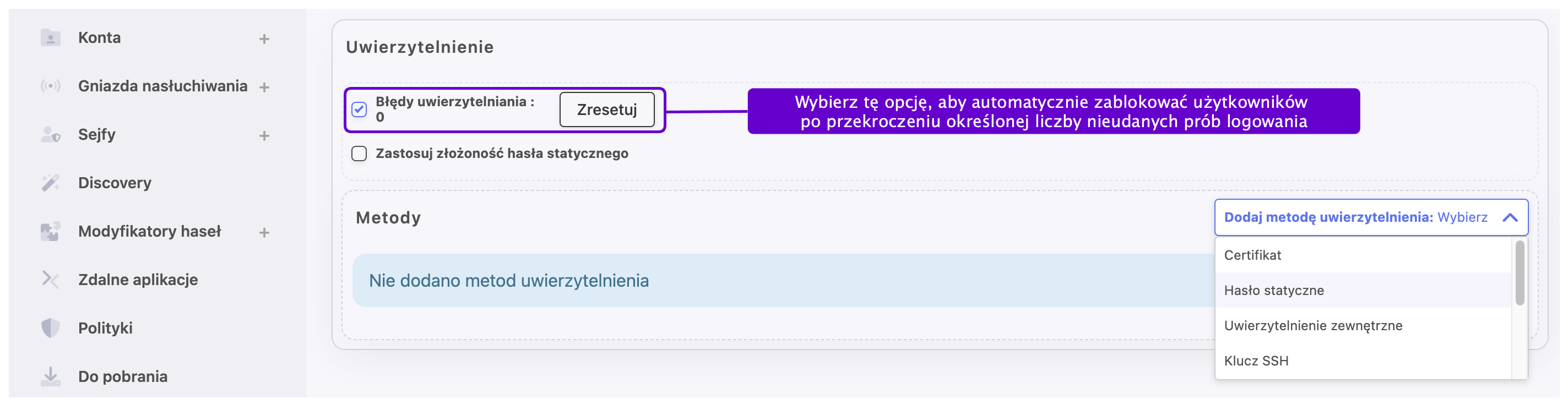 - W sekcji Uwierzytelnienie, zaznacz opcję Niepowodzenia uwierzytelnienia, aby konto zostało automatycznie zablokowane w przypadku przekroczenia limitu nieudanych prób logowania.