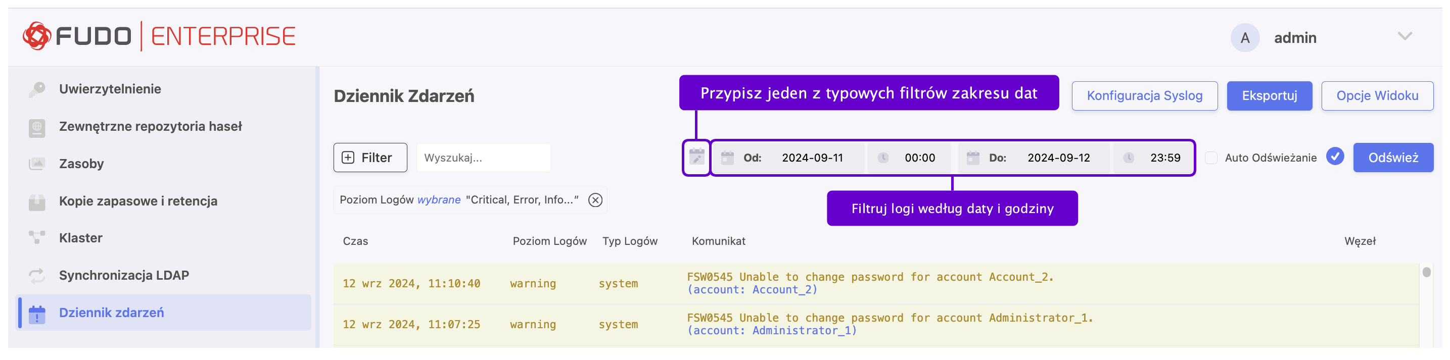 Dzienniki można filtrować według daty i czasu bezpośrednio z paska daty znajdującego się nad listą zdarzeń. Dodatkowo dostępny jest zestaw często używanych filtrów zakresu dat, takich jak Dziś, Ostatnie 24 godziny, Ten tydzień, Ostatnia 1 godzina, Ostatni rok itp., dostępnych z poziomu ikony kalendarza.