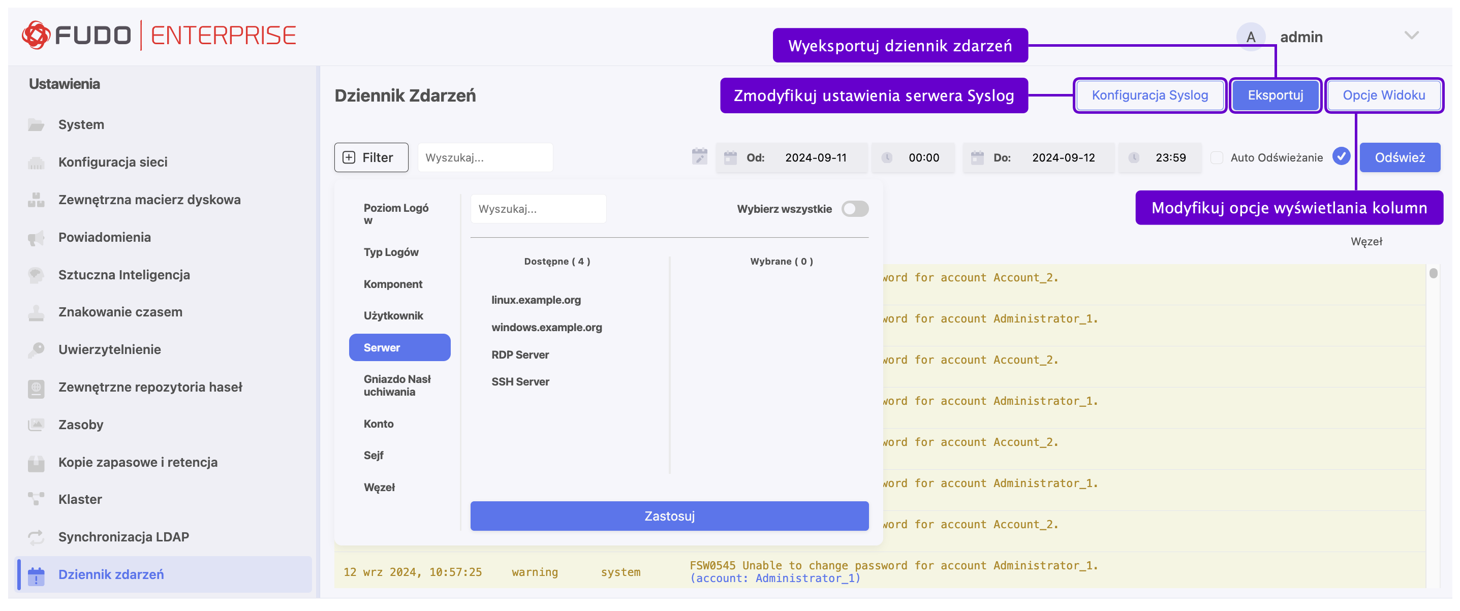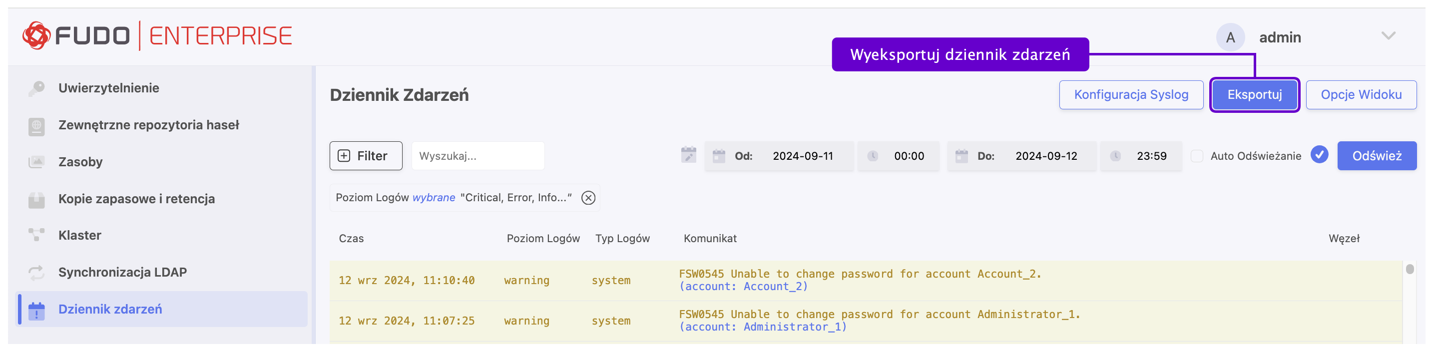 Dziennik zdarzeń stanowi wewnętrzny zapis akcji użytkowników mających wpływ na stan systemu (logowanie użytkowników, czynności administracyjne, itp.). Przejdź do rozdziału Komunikaty dziennika zdarzeń aby zapoznać się z listą kluczowych komunikatów dziennika.