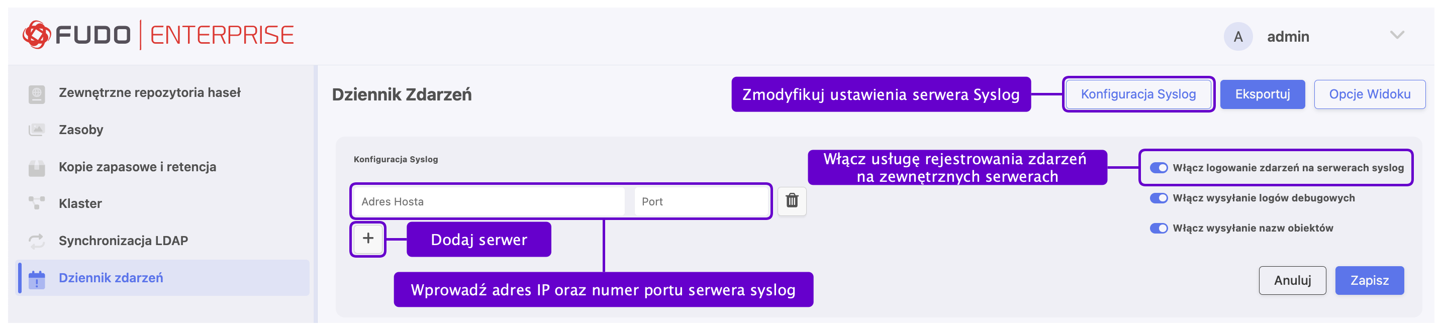 Aby skonfigurować usługę rejestrowania zdarzeń na zewnętrznych serwerach Syslog, postępuj zgodnie z poniższą instrukcją.