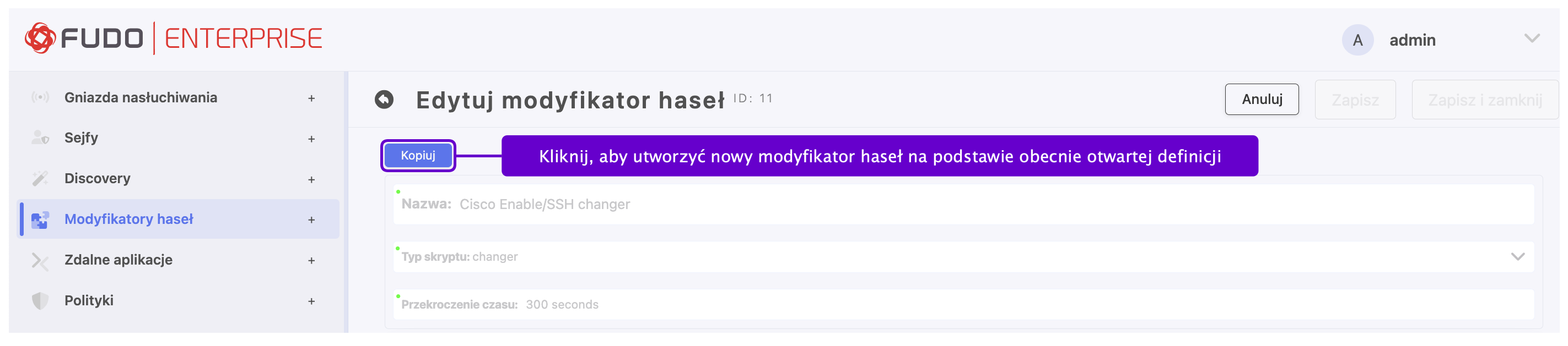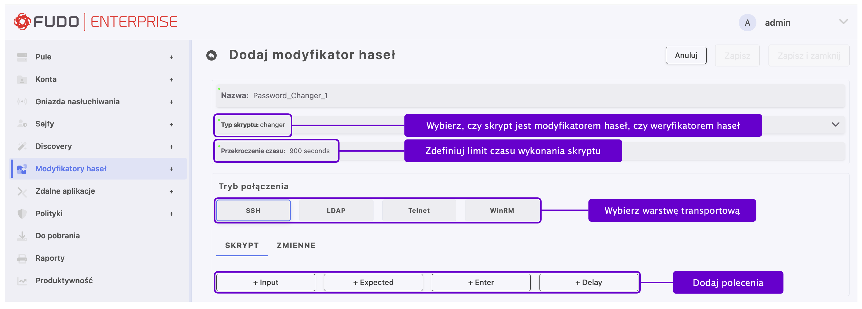 Uniwersalne modyfikatory haseł umożliwiają zdefiniowanie sekwencji komend, które zostaną wykonane na zdalnej maszynie w celu zmiany hasła.