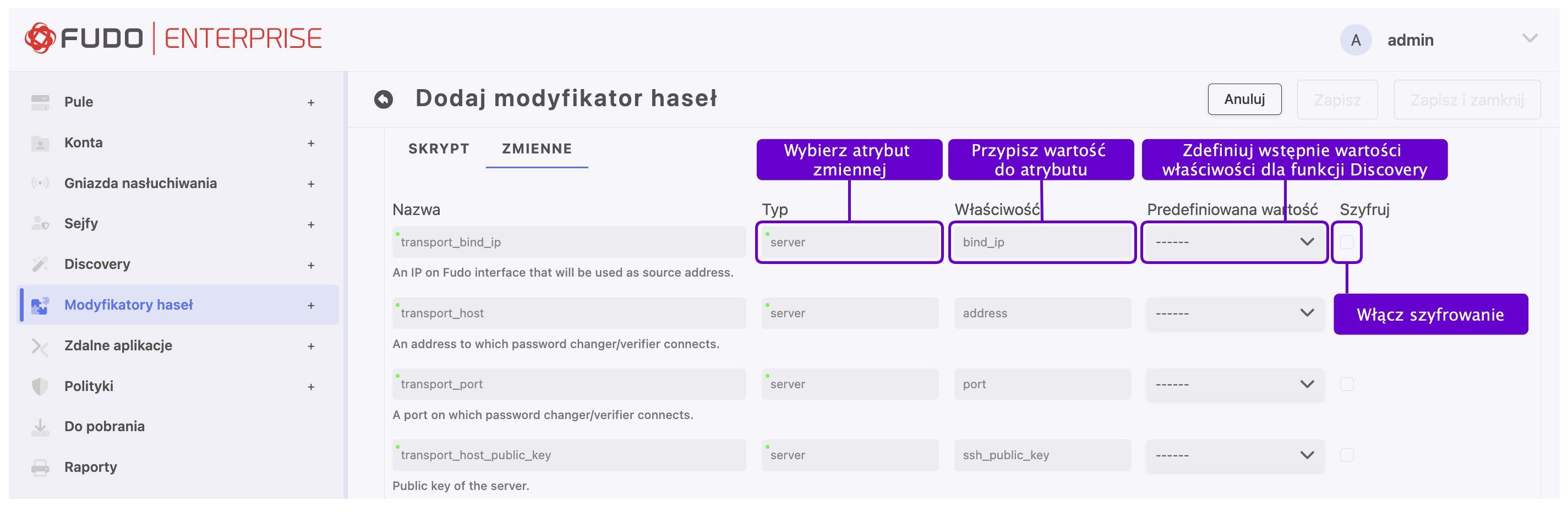W zakładce Zmienne zdefiniuj atrybuty zmiennych występujących w skrypcie.