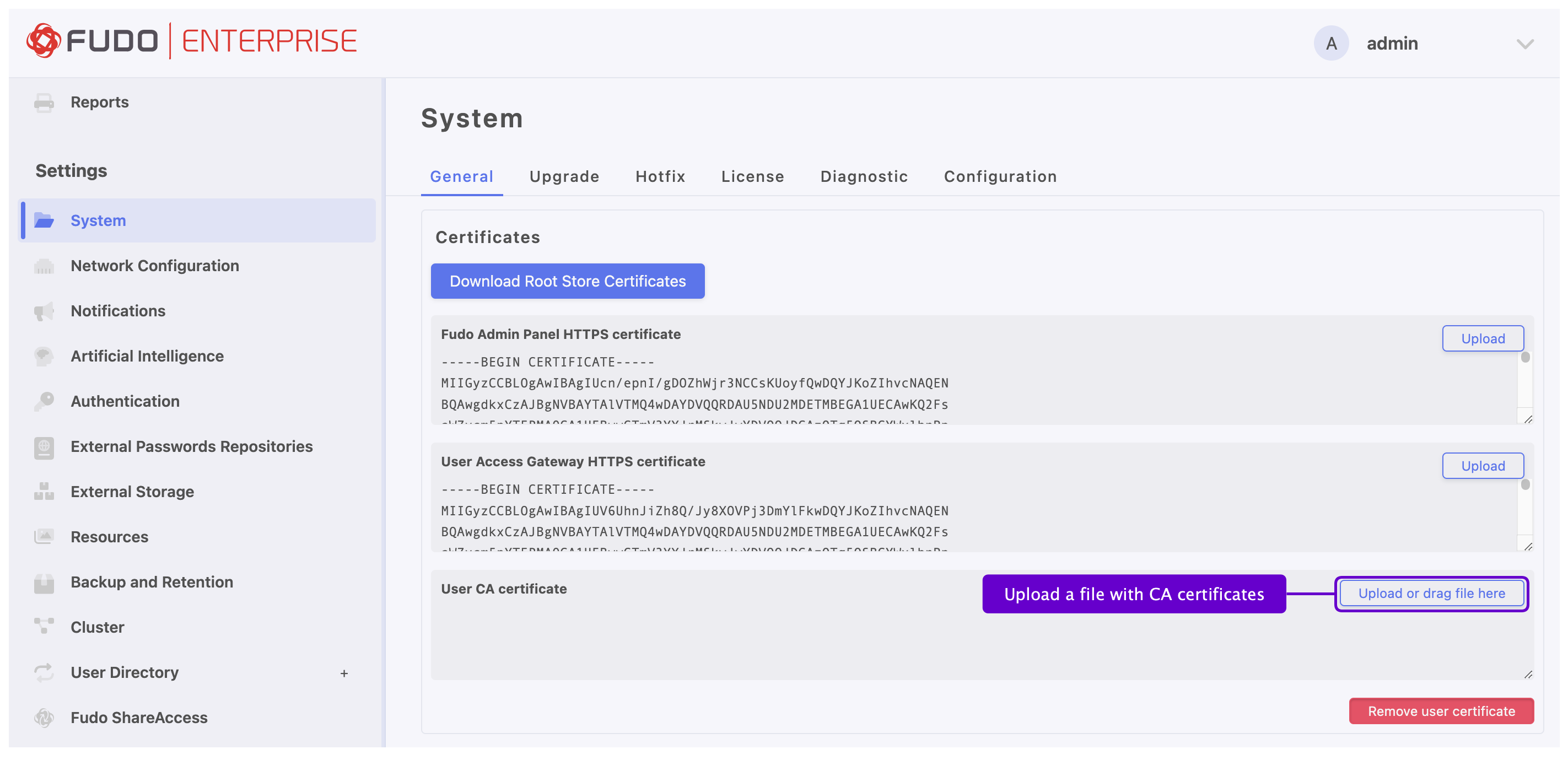 Fudo Enterprise supports a multiple-domain configuration. For such configuration, the administrator has to upload a PEM file that consists of root/intermediate certificates from all the CAs. The Subject field should be unique for each user.