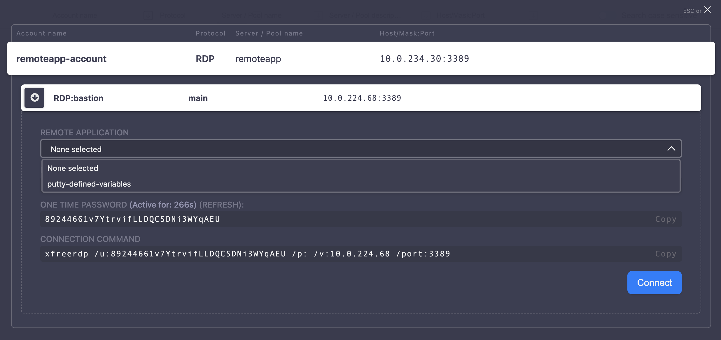 In order to establish a connection, sign in to the Access Gateway and select the respective account and a listener to be connected using the predefined remote application: