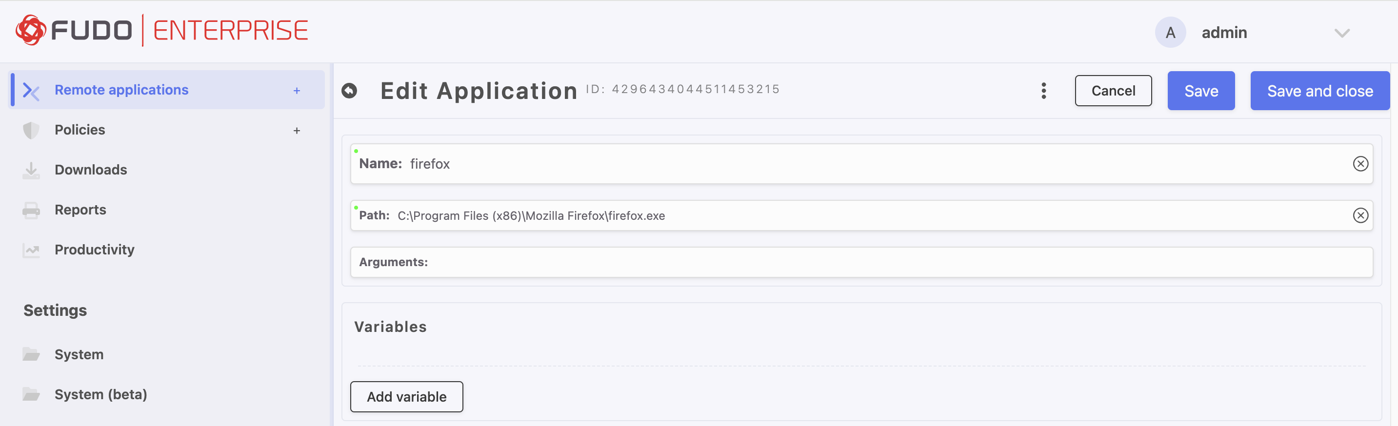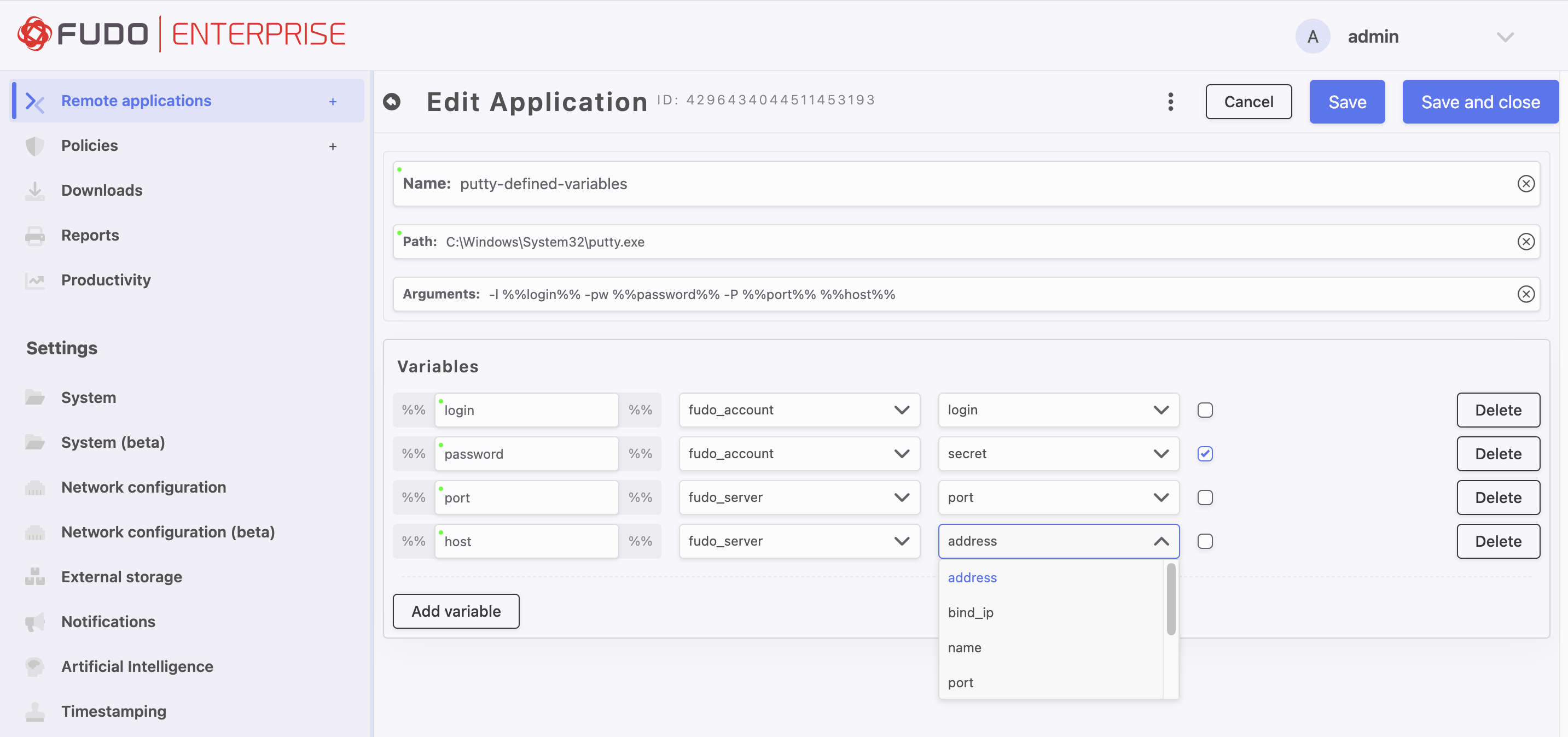 Remote Applications allow administrators to set commands that execute automatically at launch, enabling seamless connections with pre-filled login credentials and connection details. Variables can also be created to retrieve data directly from the Fudo Enterprise configuration.