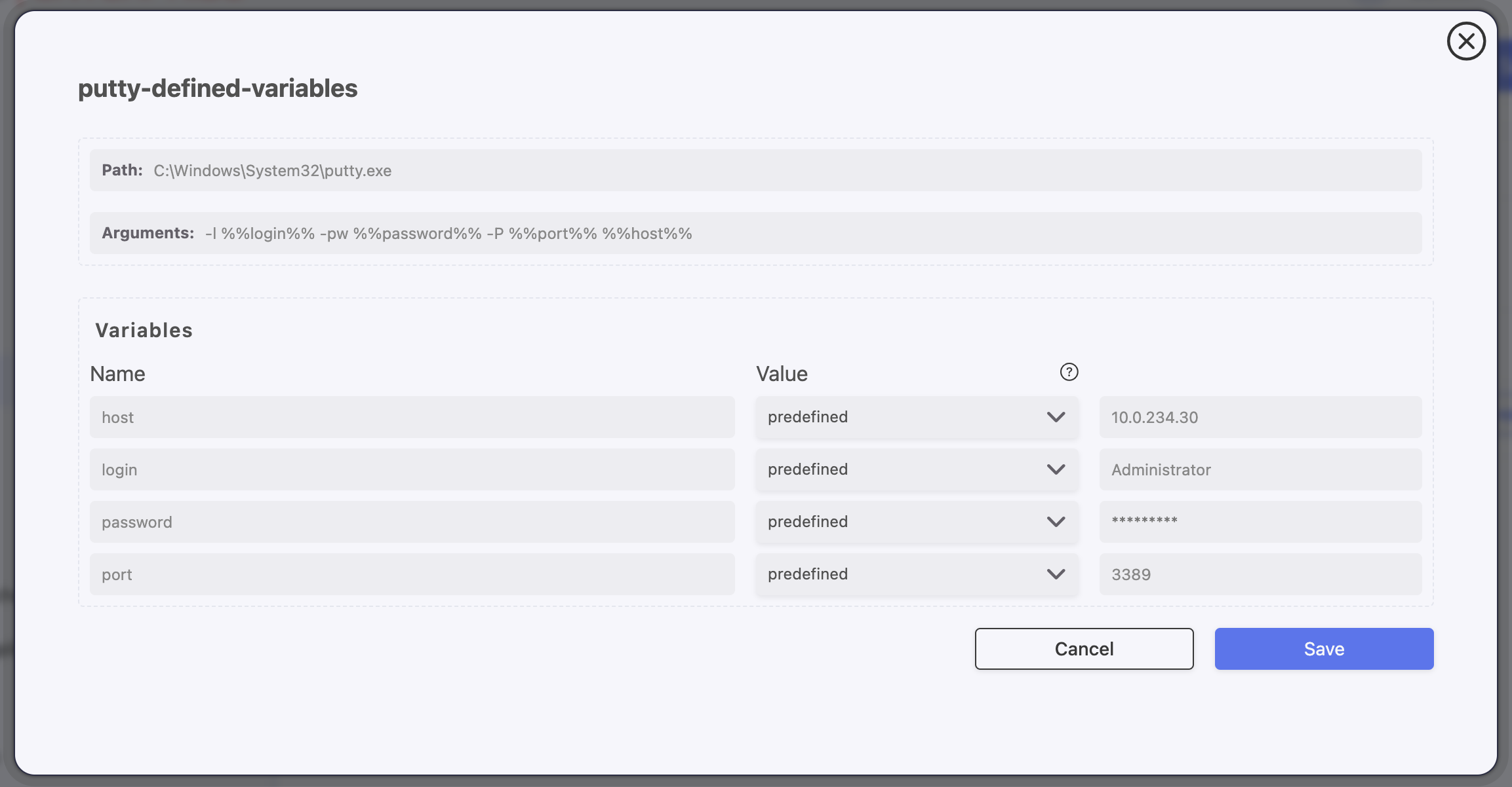Go to the Arguments field and enter the command to be executed automatically at launch. Here is an example for the PuTTY application, using variables: