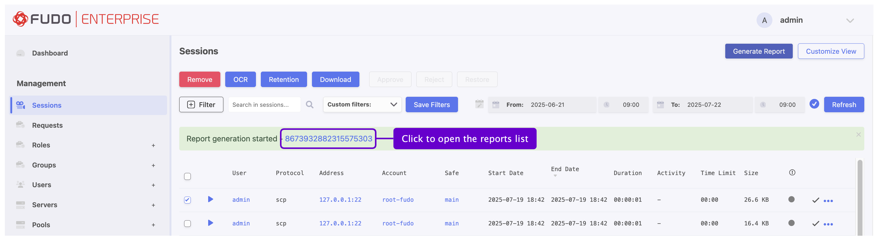 Periodic reports can be generated by users with the report-create privilege. These reports will contain only data related to session objects to which the user has access based on assigned permissions and capabilities.
