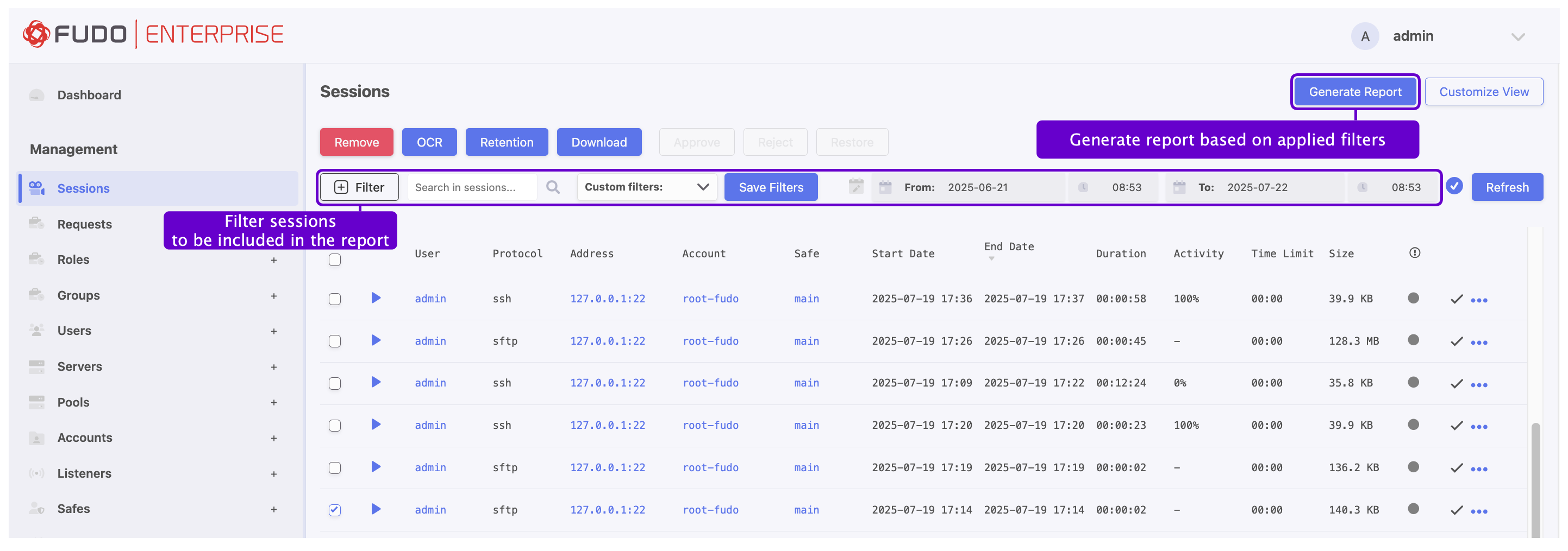 A report can be generated on demand for a specific subset of sessions, defined by filtering parameters.