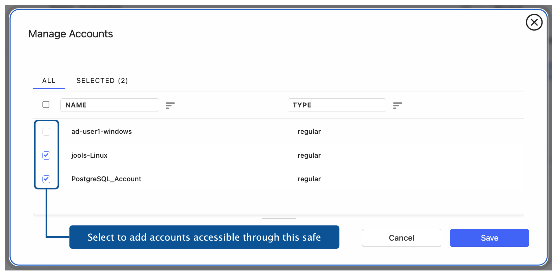 Select ACCOUNTS tab to add accounts accessible through this safe.