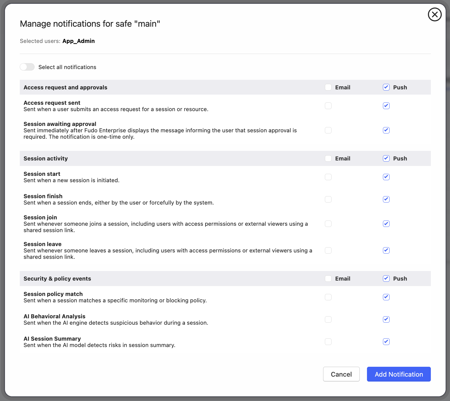 To define specific notification types for a user, select the checkbox in front of the desired users’ names and click .