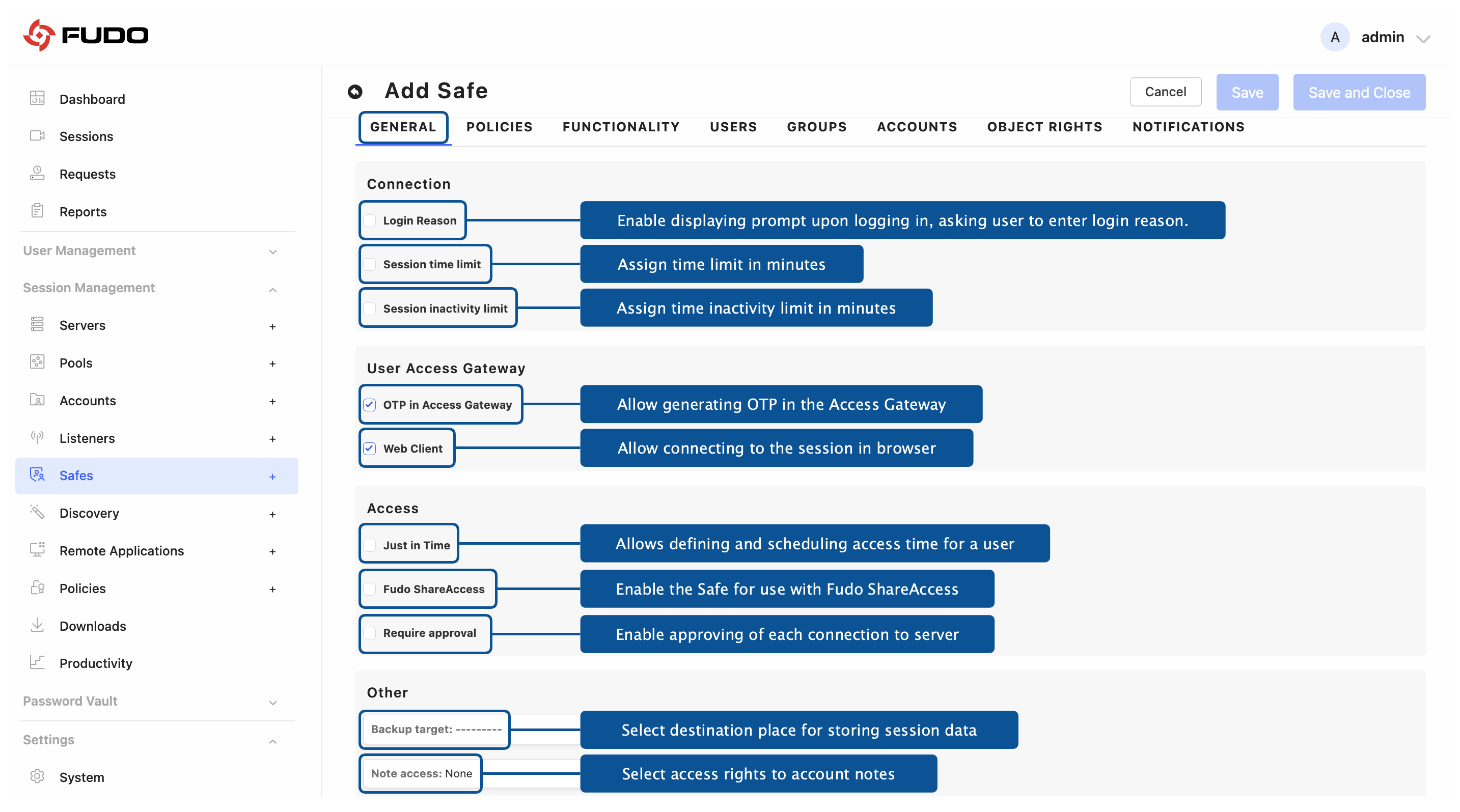 Select Require approval option to have the administrator approve each connection to servers accessed through configured safe. Provide how many minutes the administrator has to approve or reject a request. For more information, refer to the Require Approval for Access section.