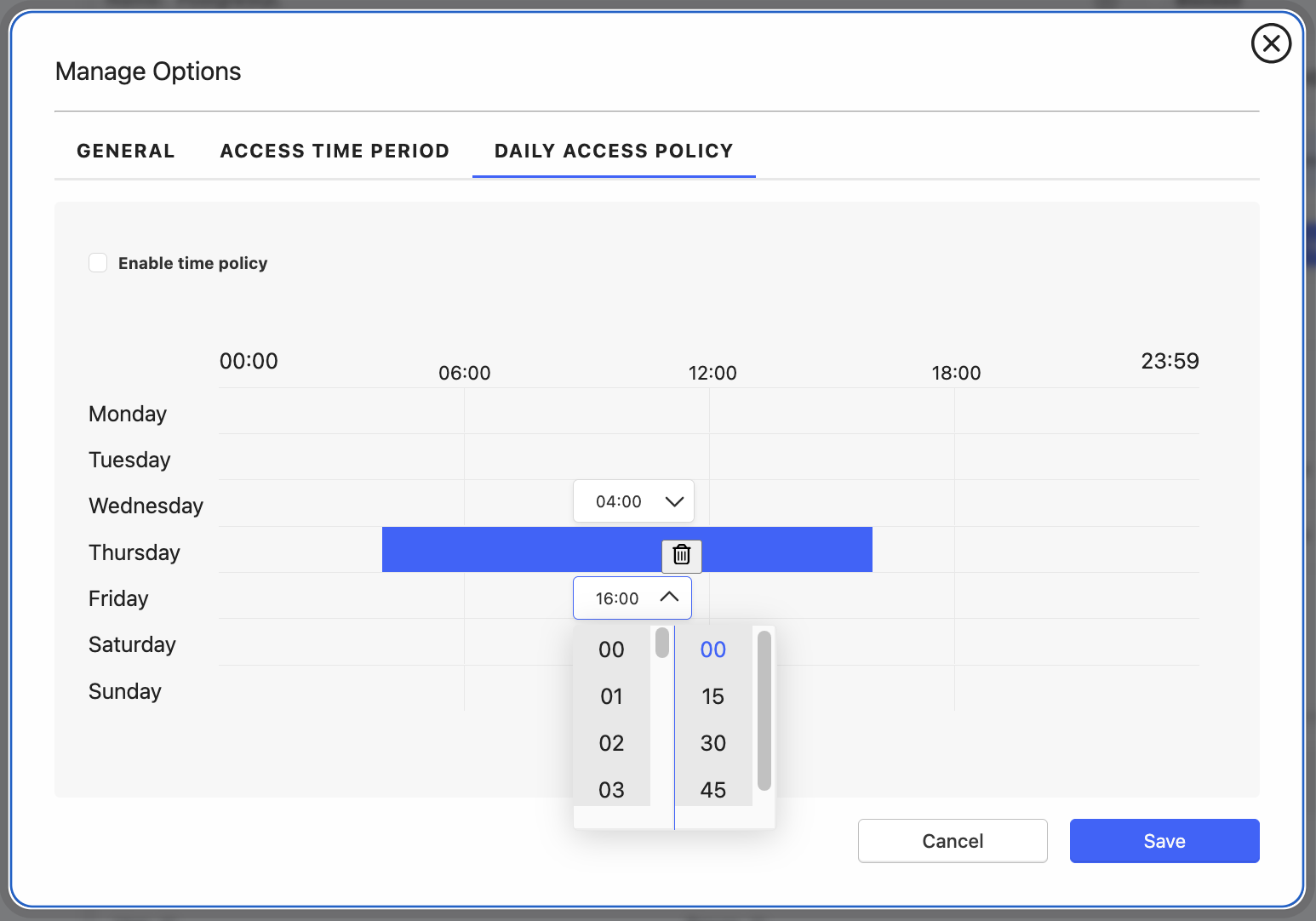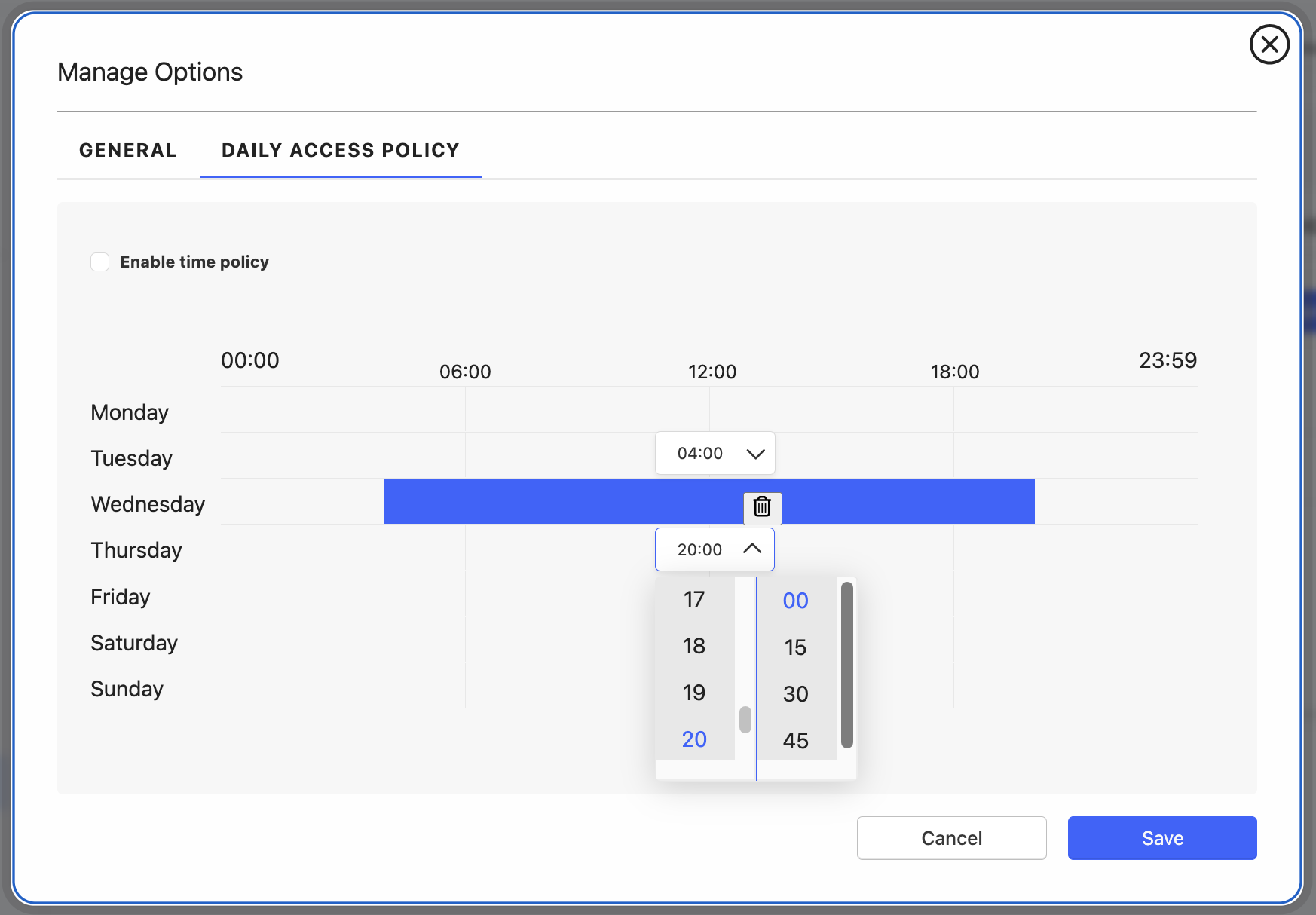 Select DAILY ACCESS POLICY tab to enable and define time intervals during which the user will be allowed to connect to servers. Just click in the row corresponding to the chosen day of the week to add a range, then click on that range to open the time range edit menu.