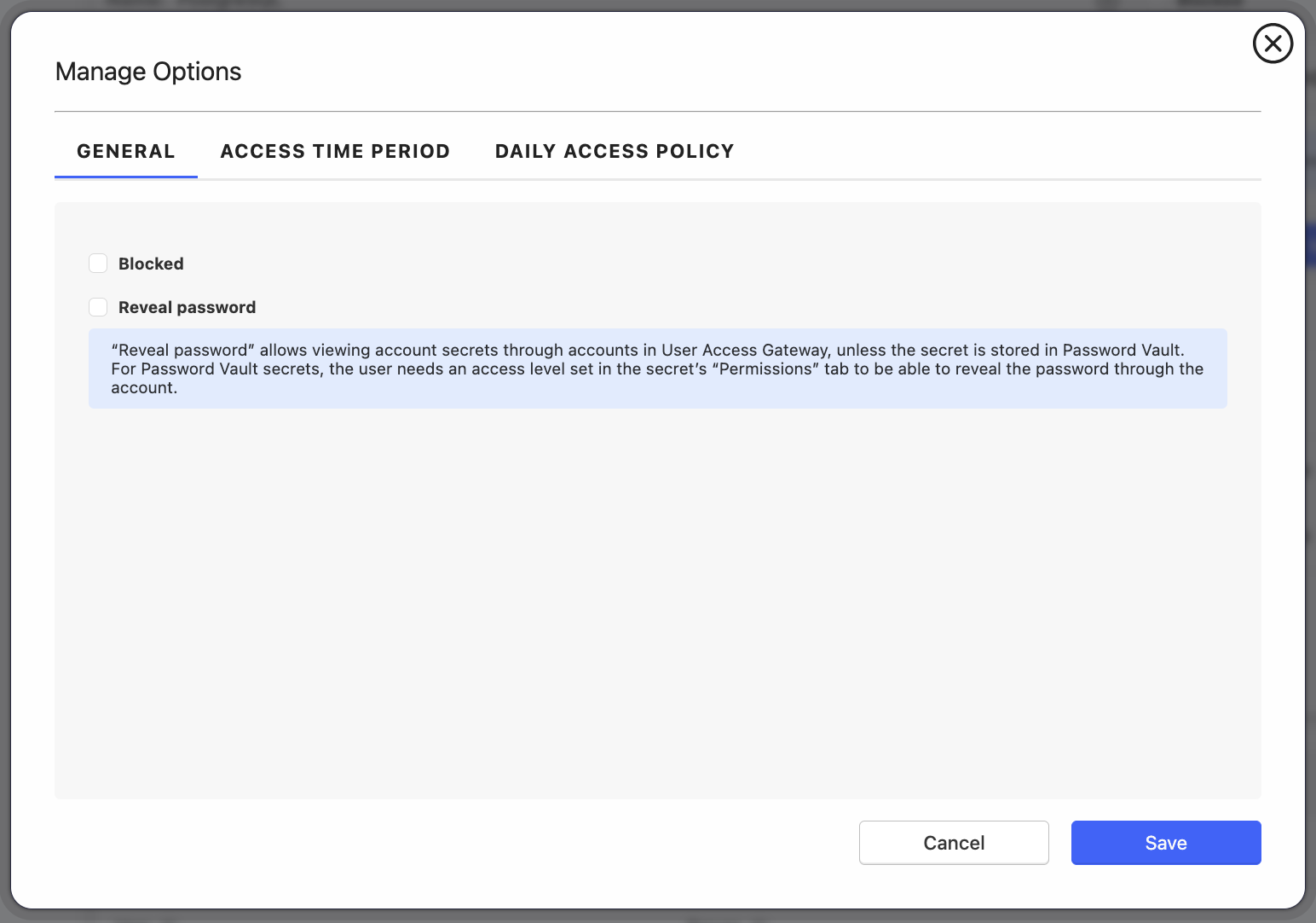 Select Reveal password to allow selected users to use Secret Checkout feature and view passwords in the Access Gateway.