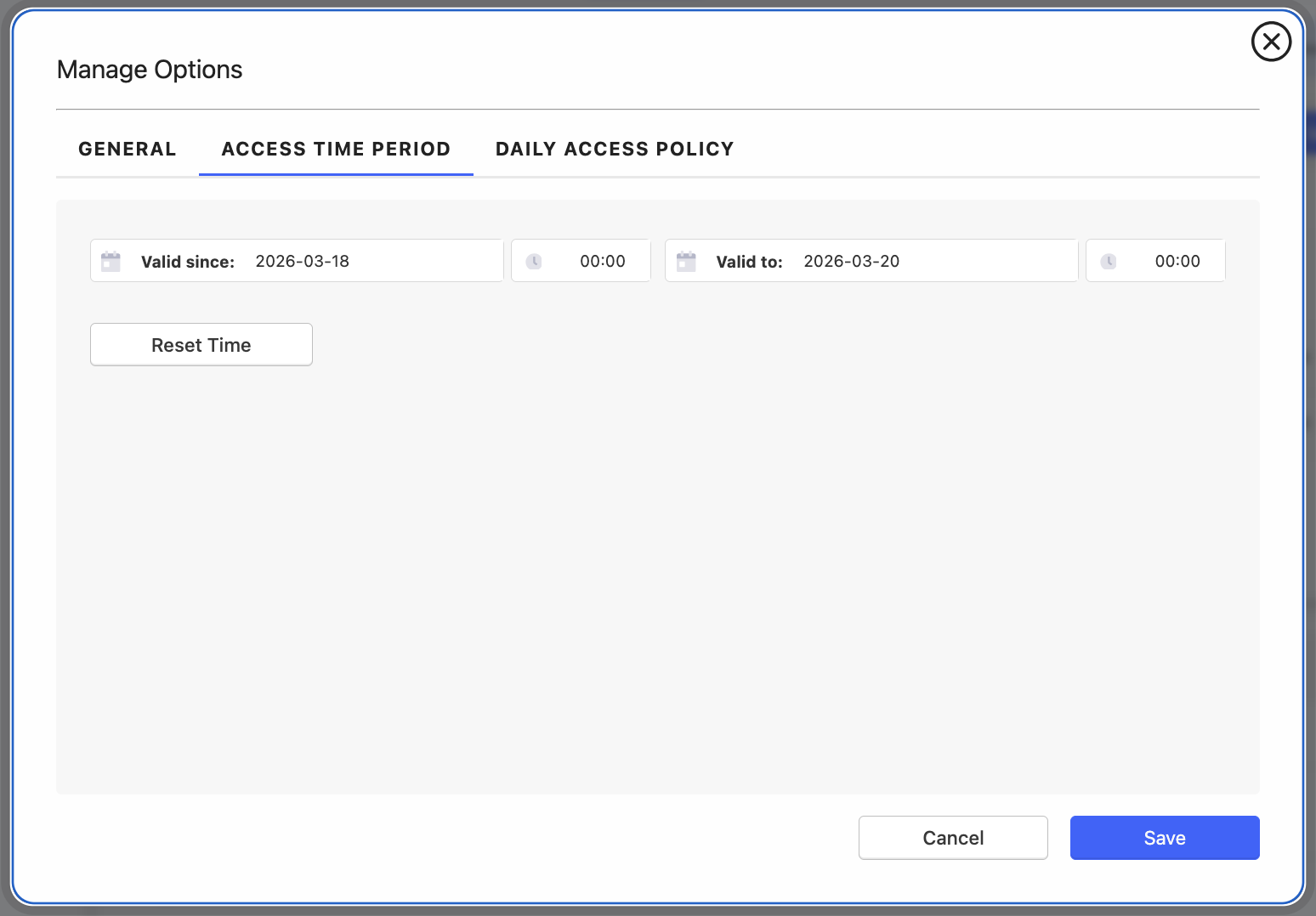 Select ACCESS TIME PERIOD tab to fill out the Valid since and Valid to fields with date and time interval when user will be allowed to access servers through the given safe. When defined date and time comes, access to the given safe is granted to the user automatically.