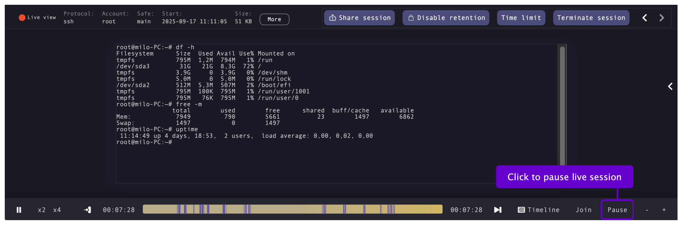 Pausing connection temporarily suspends data transmission. After resuming connection, buffered user’s actions are forwarded to the server.