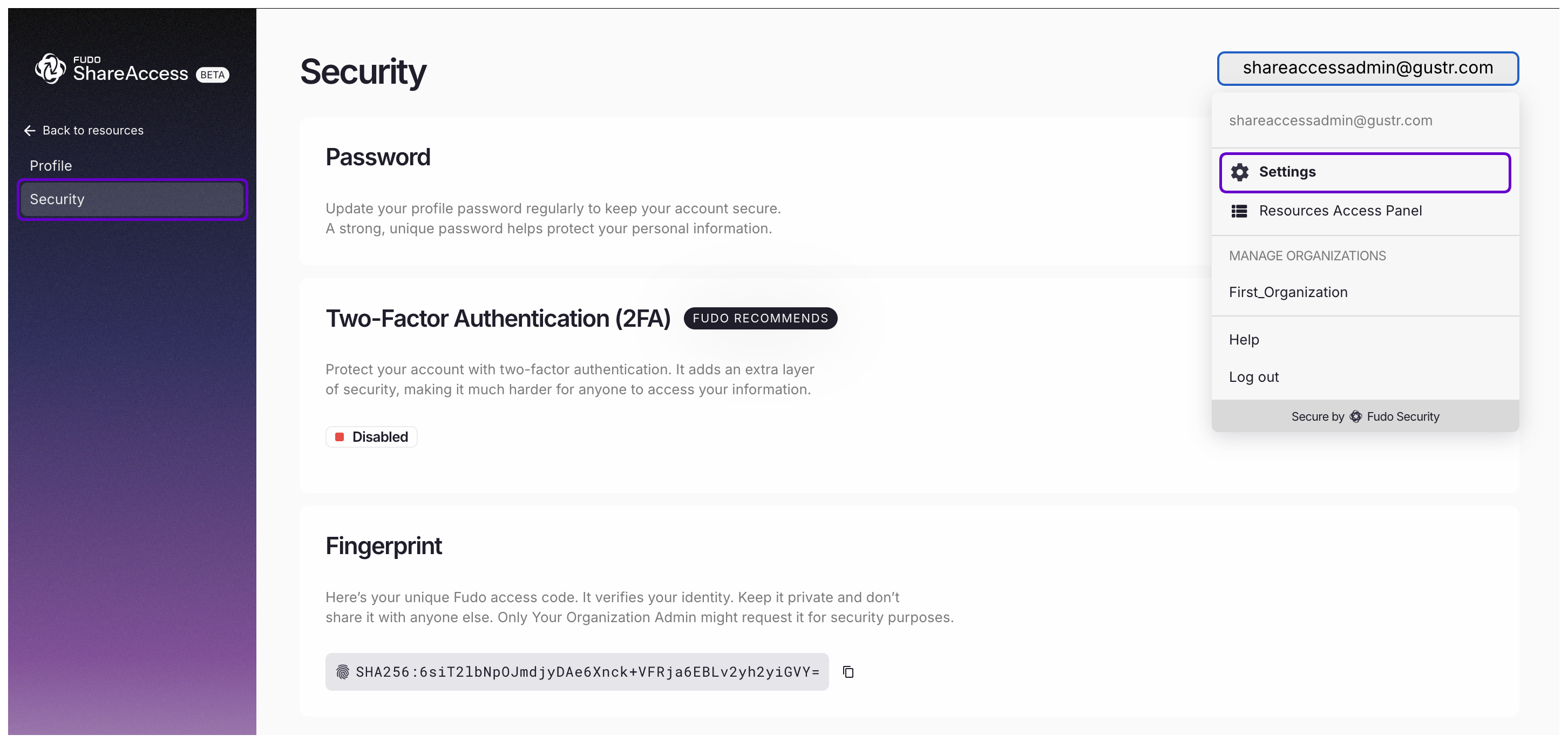 The Fingerprint Key can be viewed after logging into the Fudo ShareAccess user account, selecting Settings from the drop-down menu in the upper-right corner and then Security in the left-hand menu.