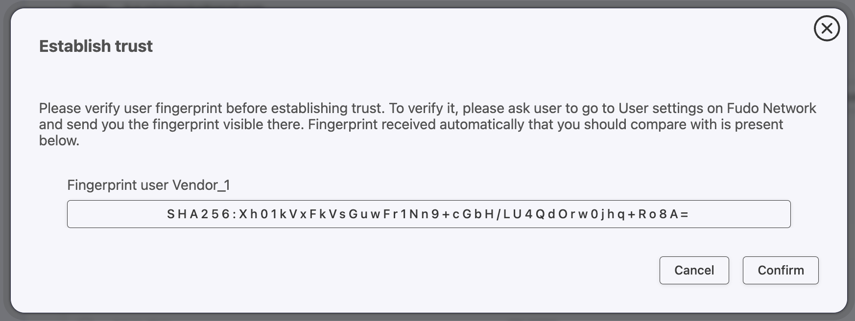 Ask user to provide the Fingerprint Key from his Fudo ShareAccess account and compare it with the fingerprint displayed in the modal window.
