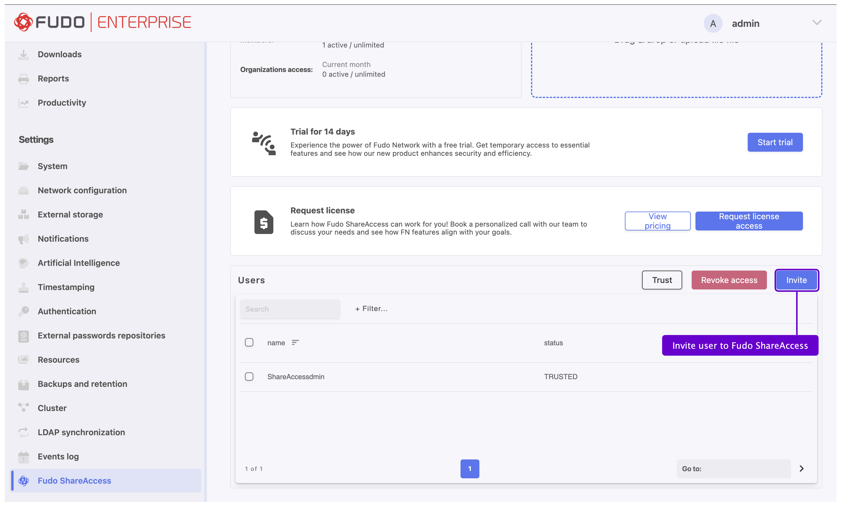 Select Settings > Fudo ShareAccess and click the Invite button.
