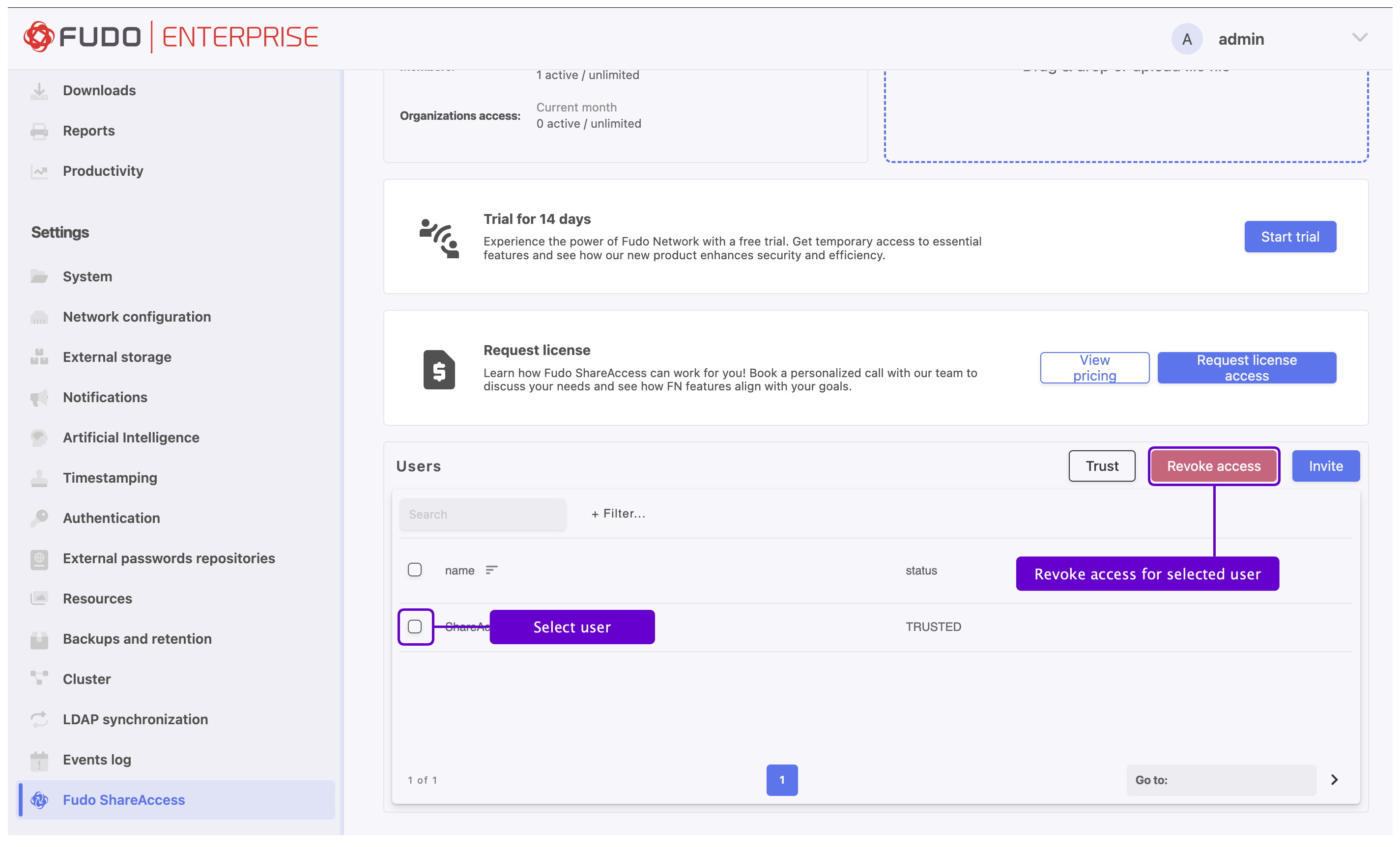 The administrator has the ability to revoke access to Fudo ShareAccess. This means the user will be disconnected from their Fudo ShareAccess account and will no longer be able to work with Fudo ShareAccess. To carry out this procedure:
