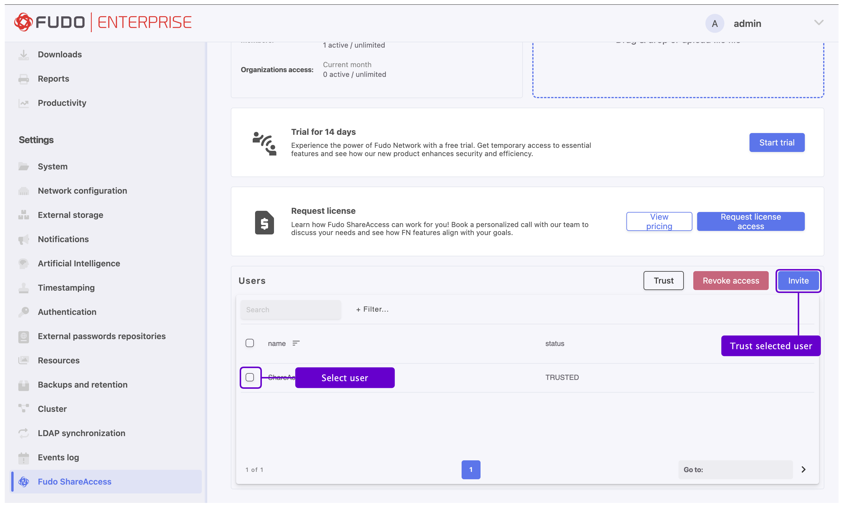 Fudo ShareAccess requires a user to be Trusted in order to access assigned resources: