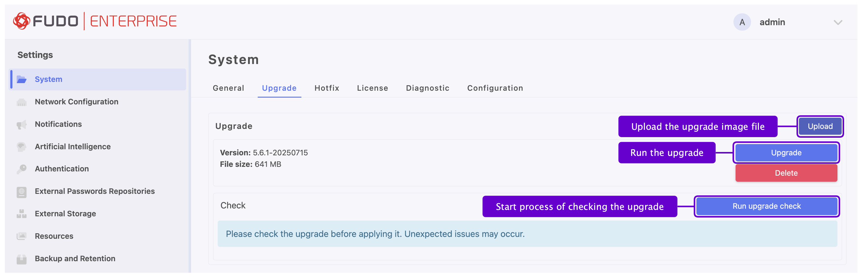 If the storage usage on the system being updated exceeds 85%, contact Fudo Enterprise technical support before proceeding with upgrading the system.
