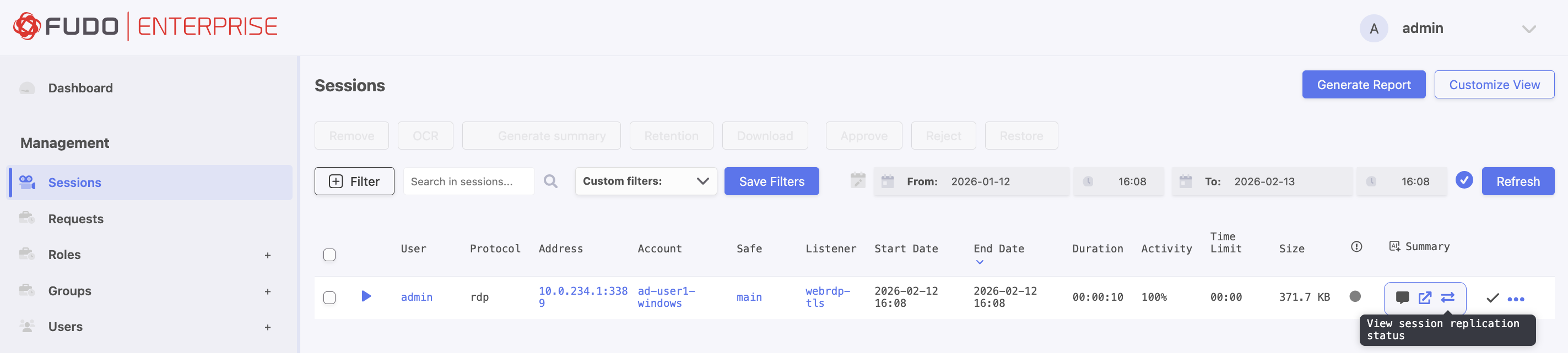 To check the session replication status, locate the connection in the session list and click the i icon.