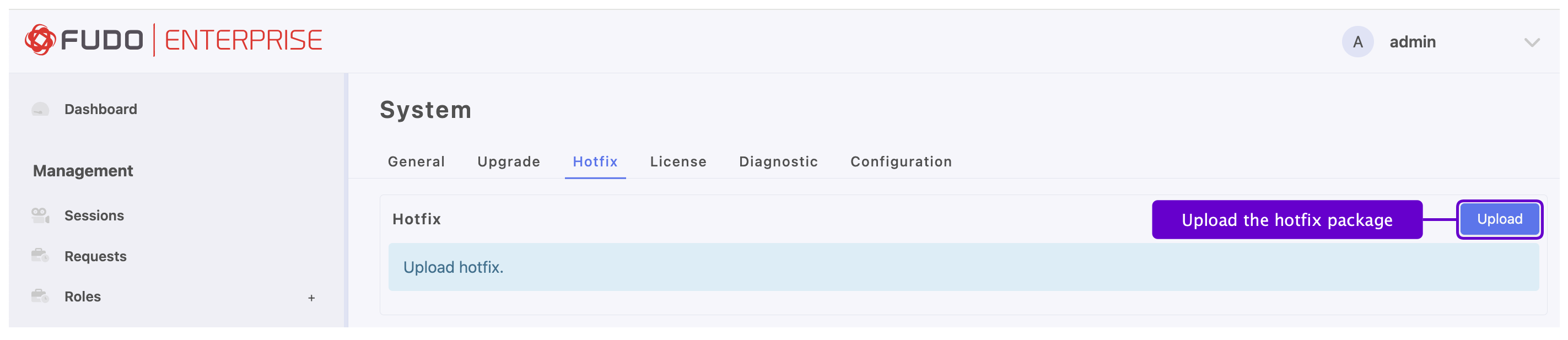 The Hotfix feature allows the administrator to upload a minor fix through the Fudo Admin Panel. The fix package is provided by the Fudo Support Team. No additional support actions or system upgrade are required.