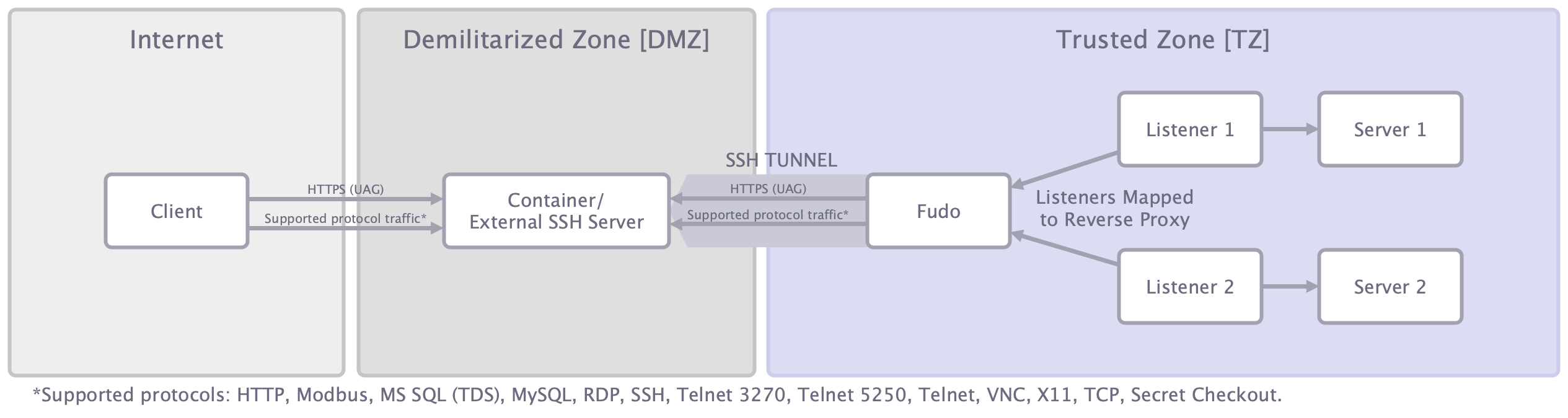 The external SSH server/container serves as the access point for users connecting through the Reverse Proxy. Instead of connecting directly to Fudo, clients establish their connection to this external server, which then forwards traffic through the reverse SSH tunnel into the internal environment. As a result, this server is not just an auxiliary host — it is the endpoint that users will connect to when accessing internal resources.