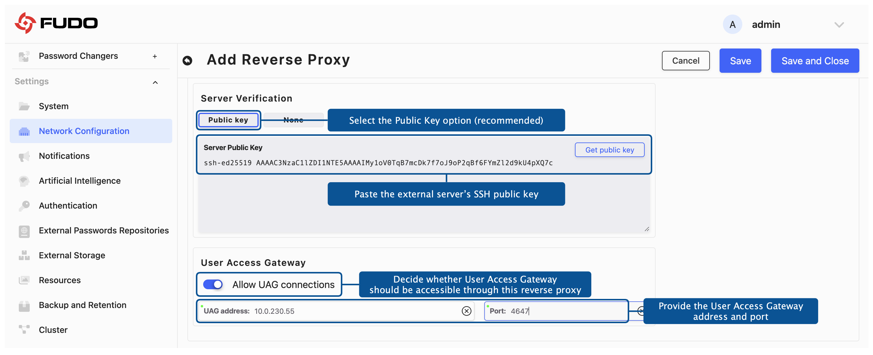 The public key required for authentication on the external SSH server can be obtained directly from the Reverse Proxy configuration in Fudo Enterprise.