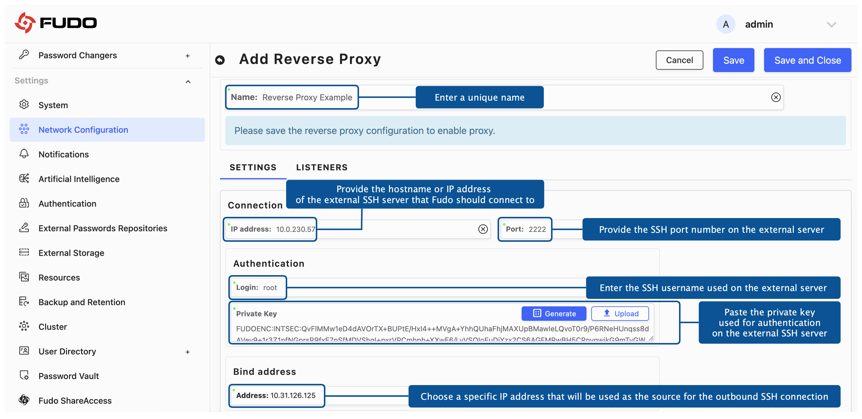 Reverse Proxy – DMZorSSH Tunnel to Reporting Server.In the IP address field, provide the hostname or IP address of the external SSH server that Fudo should connect to.