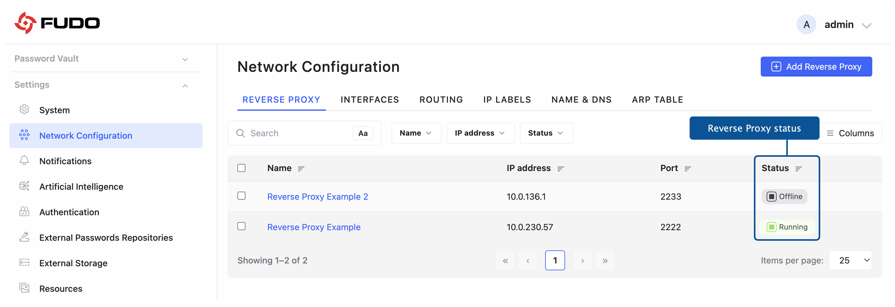 The Reverse Proxy can display one of the following four status values: