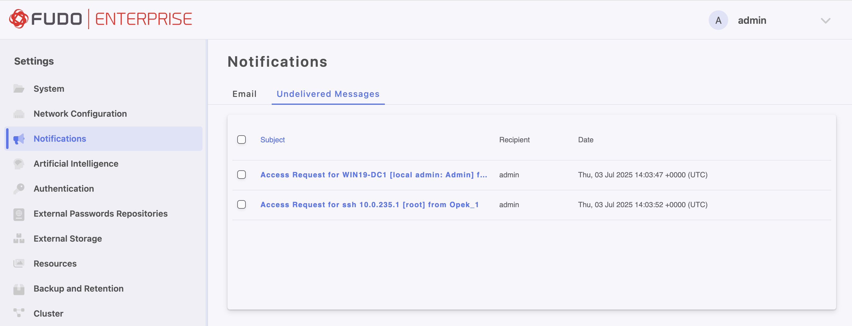 Fudo Enterprise can send email notifications concerning defined connections.
