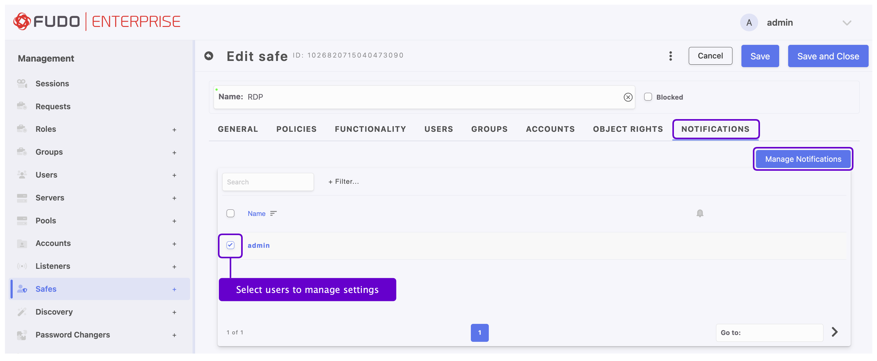 In order for a user to receive notifications, an administrator must log in to the Fudo Enterprise Admin Panel, edit the safe object, and assign notifications to that user in the Notifications tab. This action must be repeated for each user who should receive notifications. For detailed instructions, see the Creating Safes section.