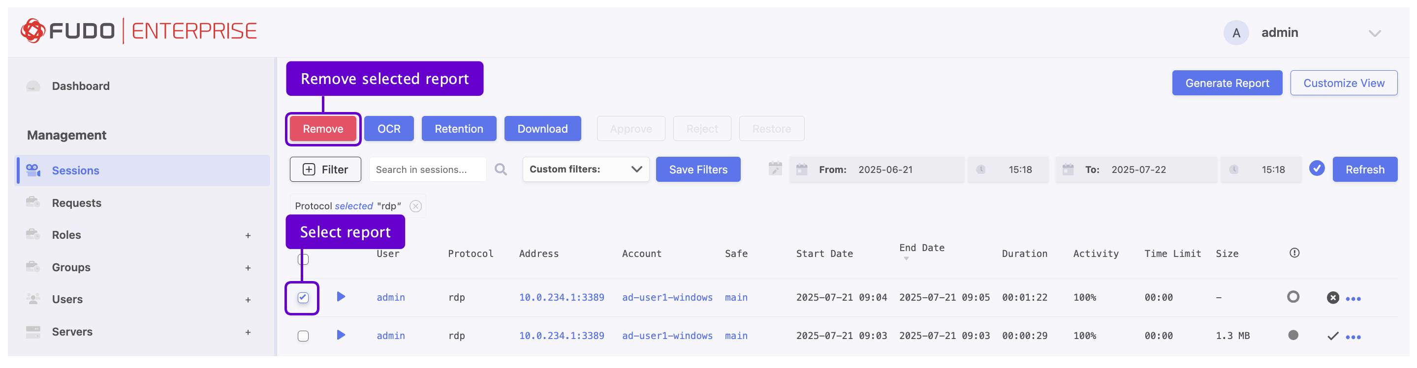 Periodic reports can be generated by users with the report-create privilege. These reports will contain only data related to session objects to which the user has access based on assigned permissions and capabilities.
