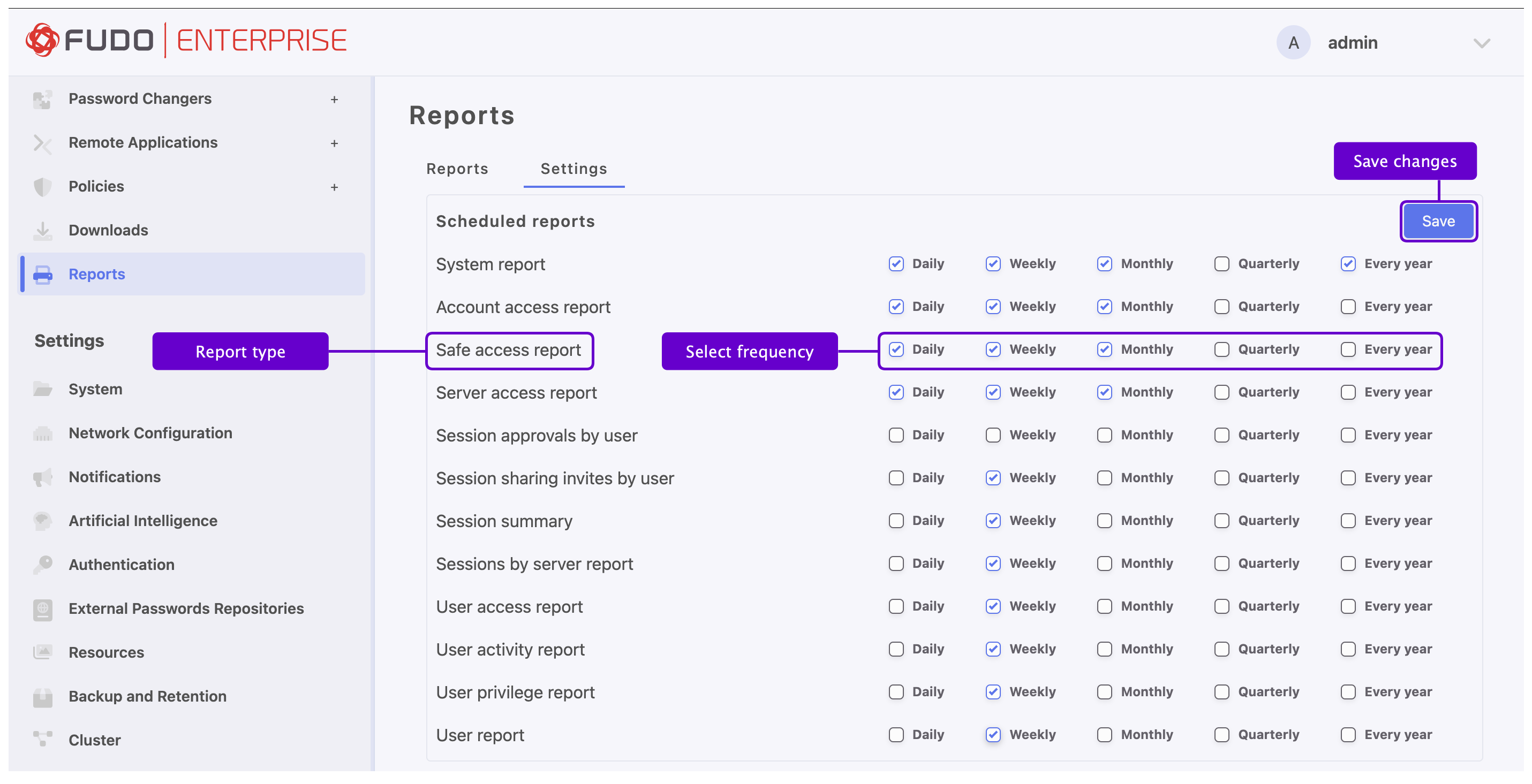 In the row of the selected report, define the generation frequency.