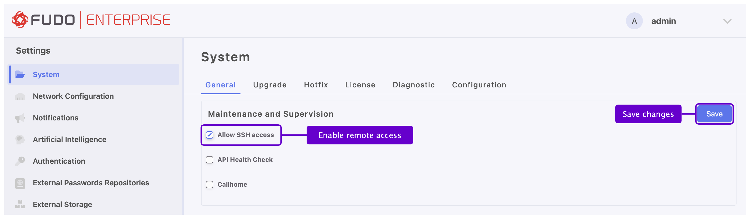 SSH access option enables remote access to Fudo Enterprise for servicing and maintenance purposes.