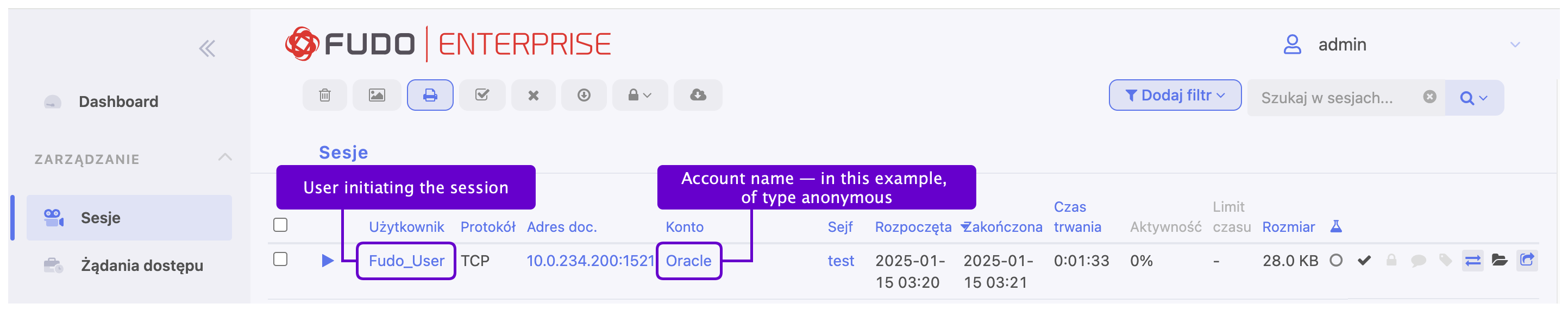 Fudo username (also if an anonymous account was used),